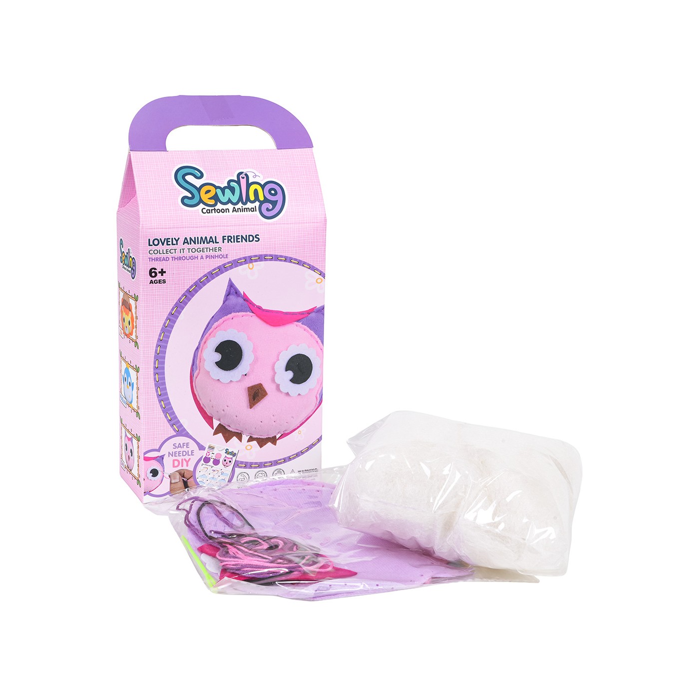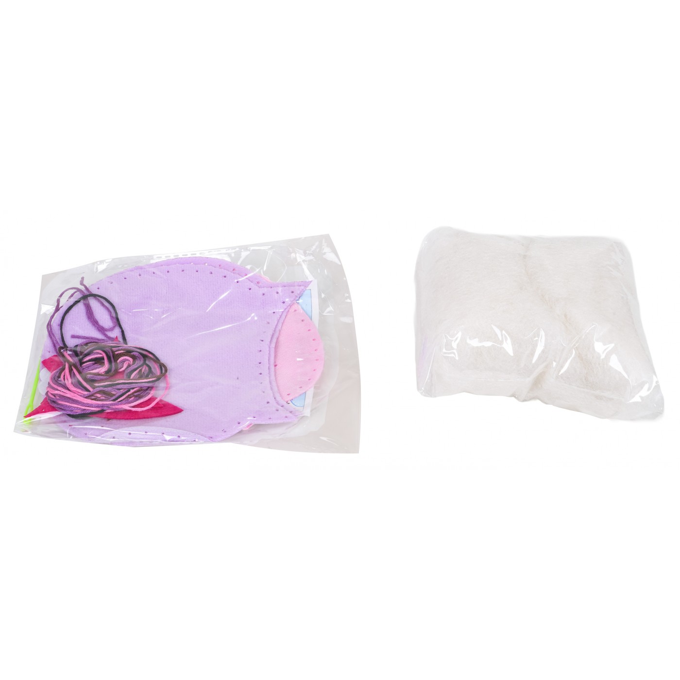 - výstrižok z látky v tvare sovy, - iné dekoratívne prvky, - náplň, - nite, - plastová ihla, - pokyny. |