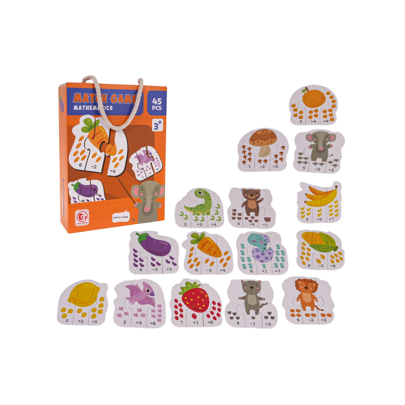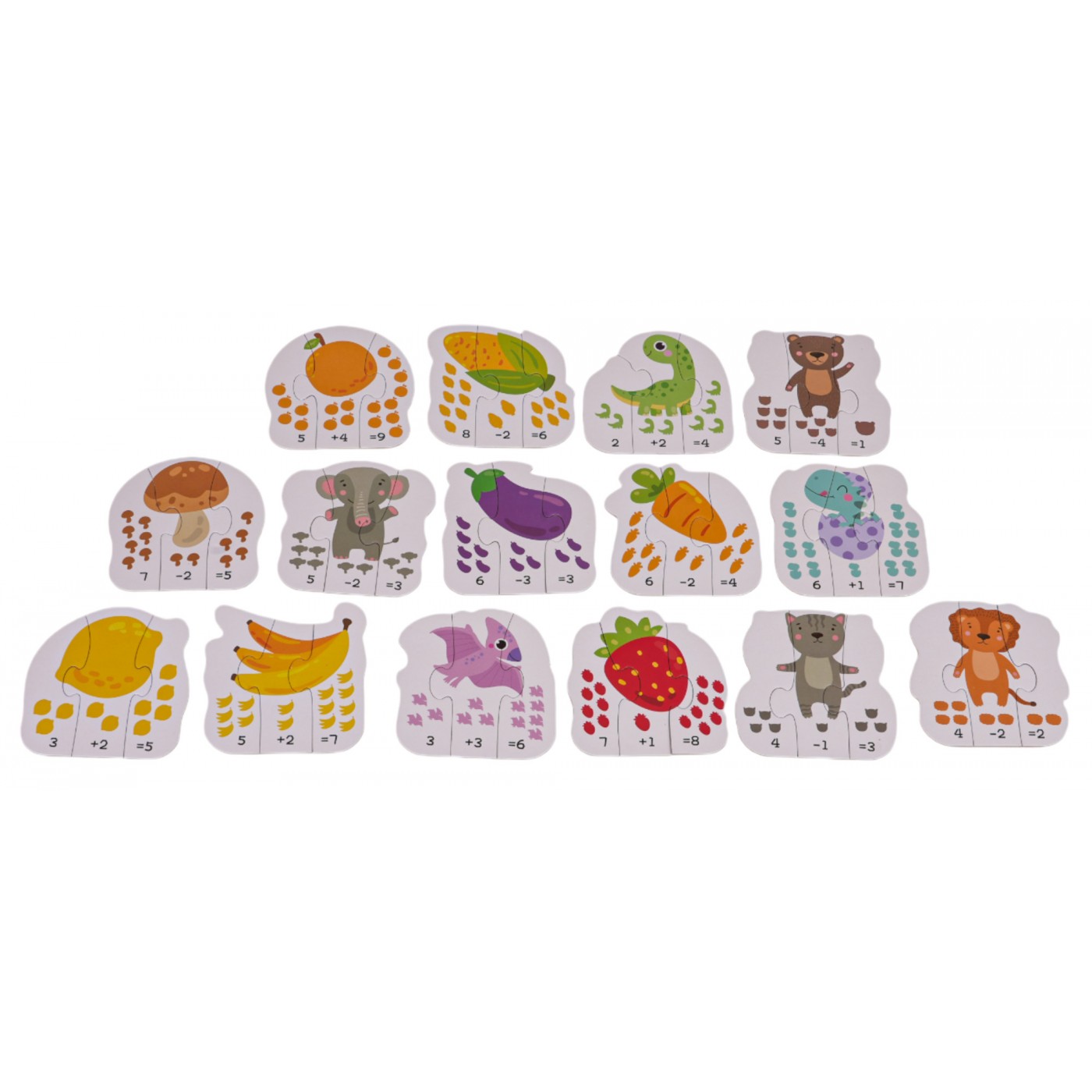 Edukačná, matematická hra Aktivity pre deti od 3 rokov. Hra pozostáva zo 45 hádaniek, vďaka ktorým sa dieťa naučí počítať od 1 do 9 a spájať tvary. Hra tiež trénuje koordináciu ruka-oko a rozvíja vnímavosť a koncentráciu. Každá tabuľa sa skladá z troch hádaniek s obrázkom (zelenina, ovocie, zvieratká) a matematickými operáciami ako sčítanie a odčítanie.