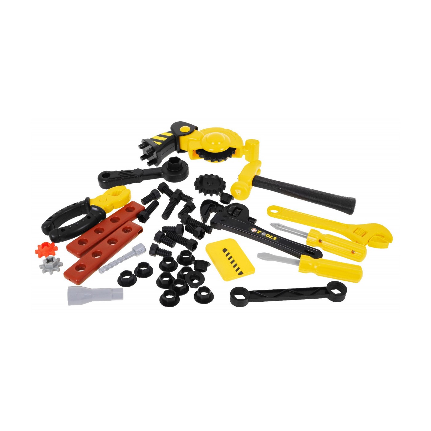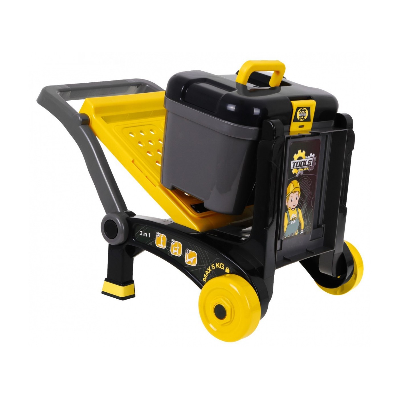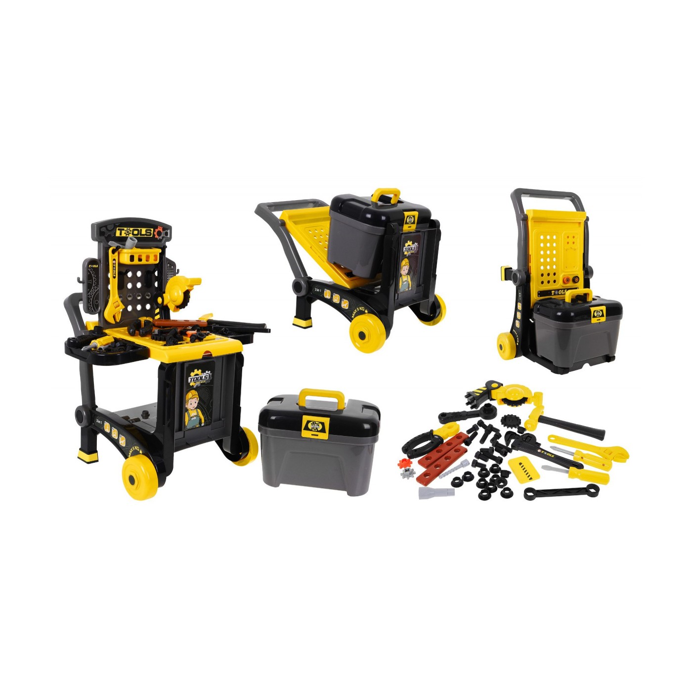 | - warsztat na kółkach transformowany w 2 różne wózki, - walizka na narzędzia, - narzędzia (obcążki, młotek, śrubokręty), - różne klucze, - imadło, - śruby i nakrętki, - piła, - naklejki do ozdobienia warsztatu. | |