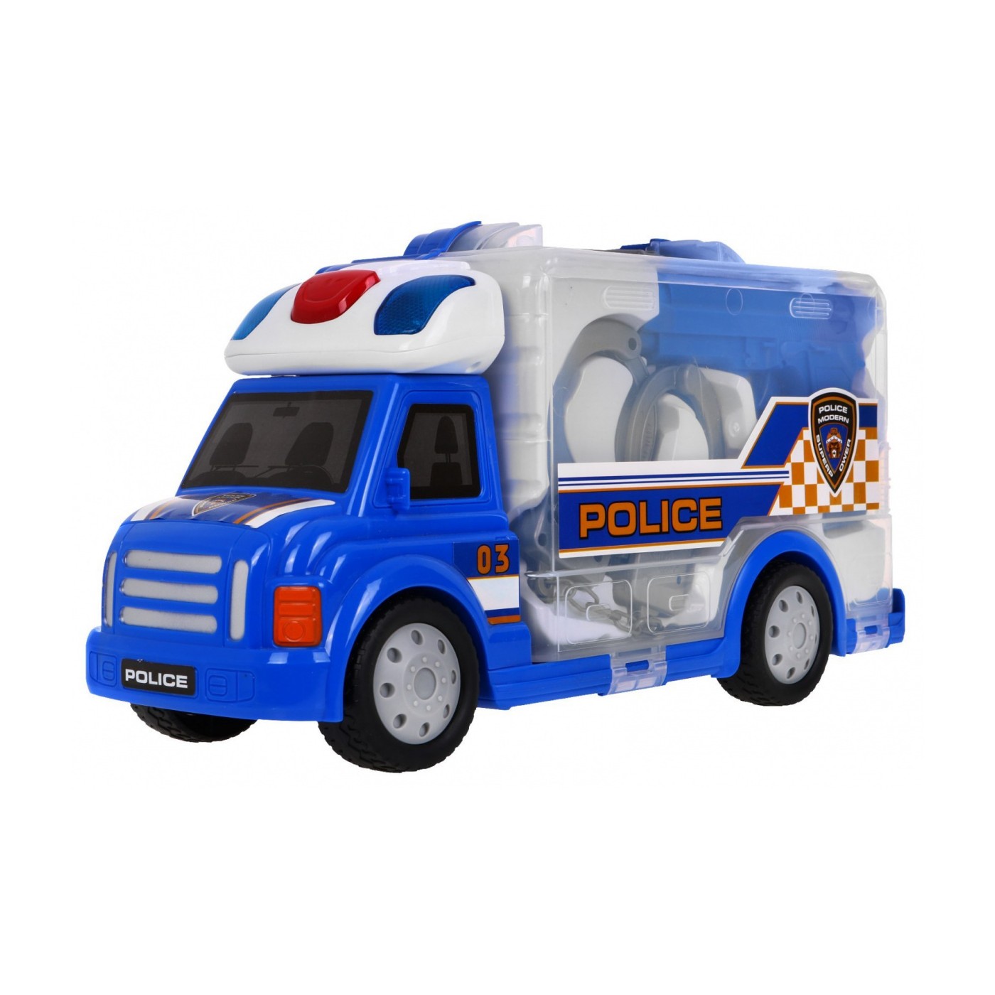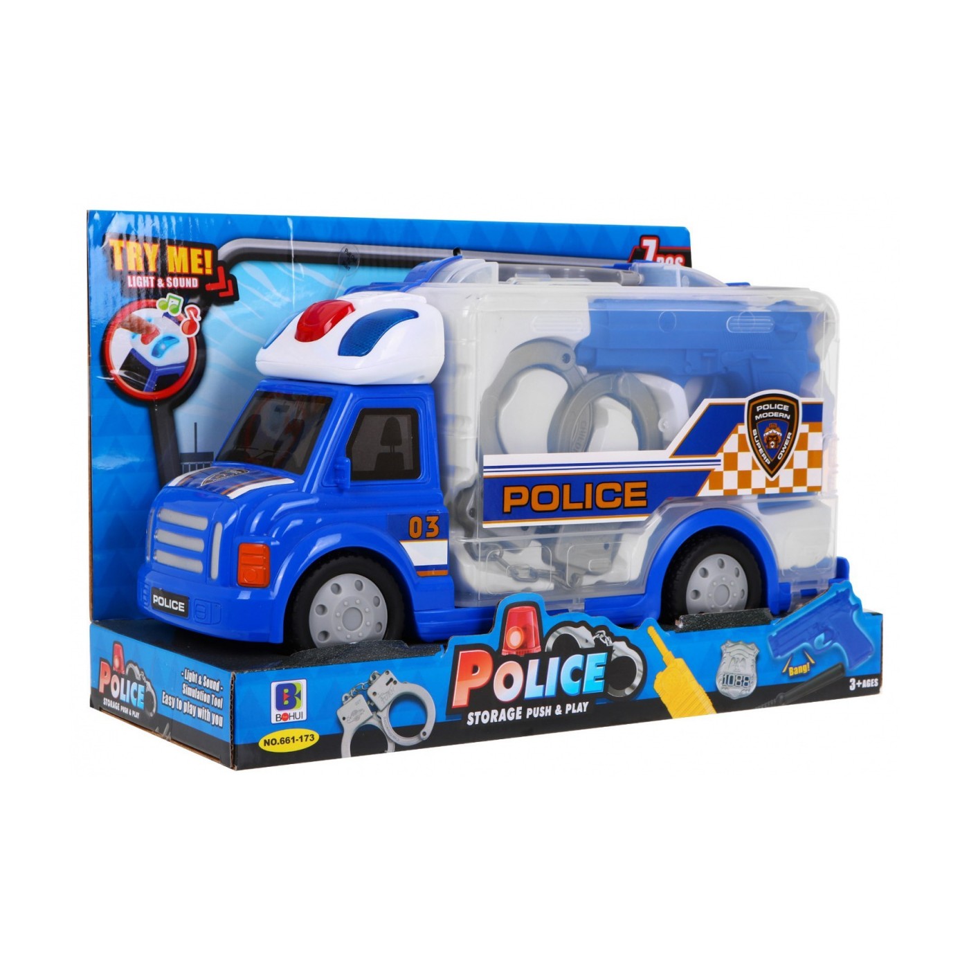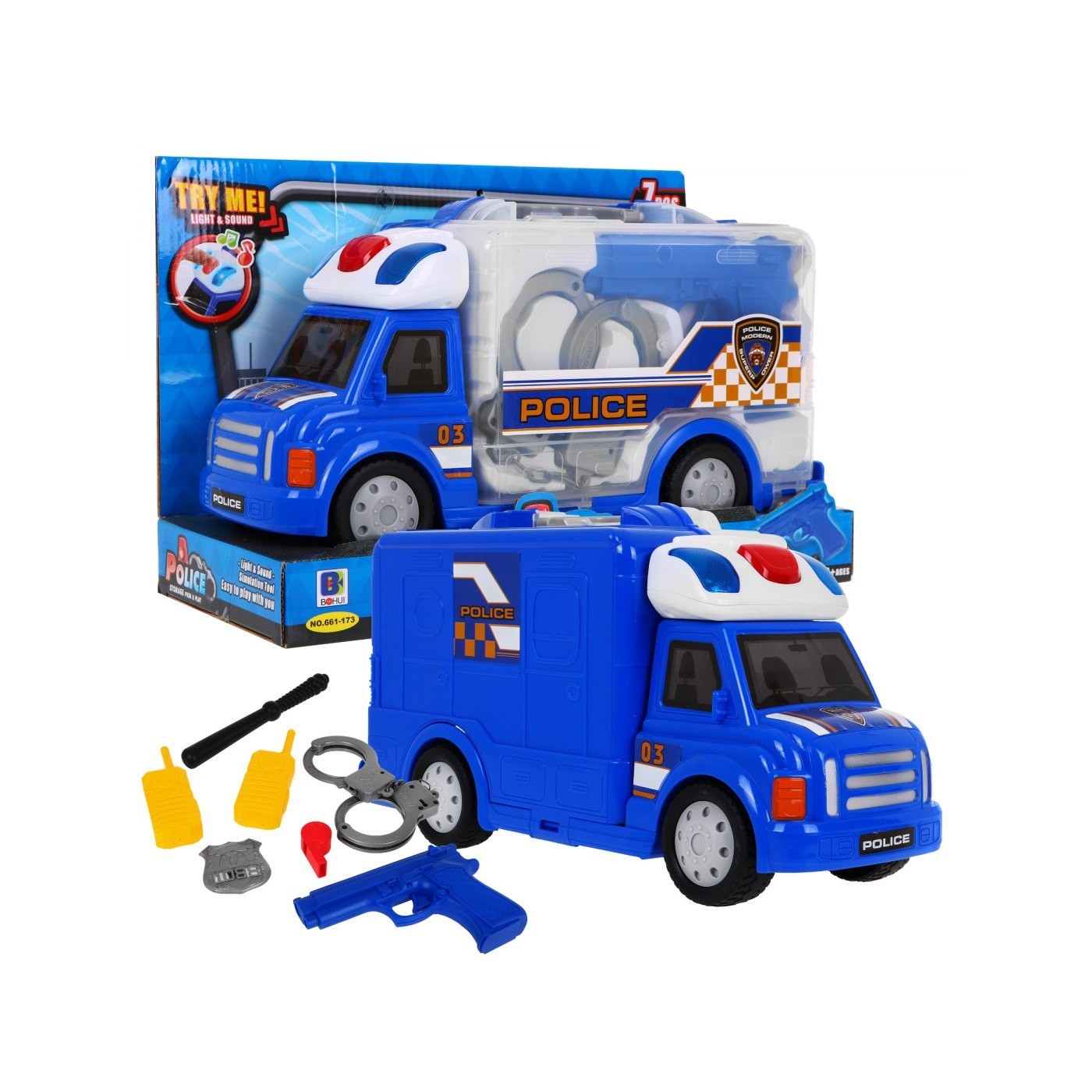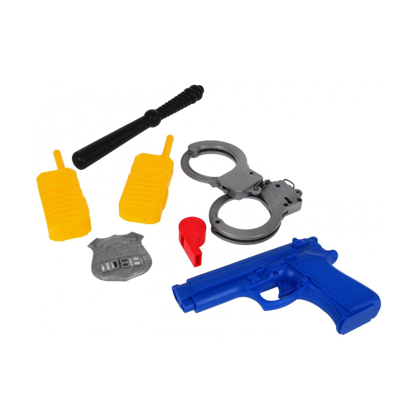 | - pistolet w kolorze niebieskim zasilany bateriami, wydający odgłos wystrzału po naciśnięciu spustu, - kajdanki, - czerwony gwizdek, - pałka policyjna, - 2 krótkofalówki, - odznaka. | |