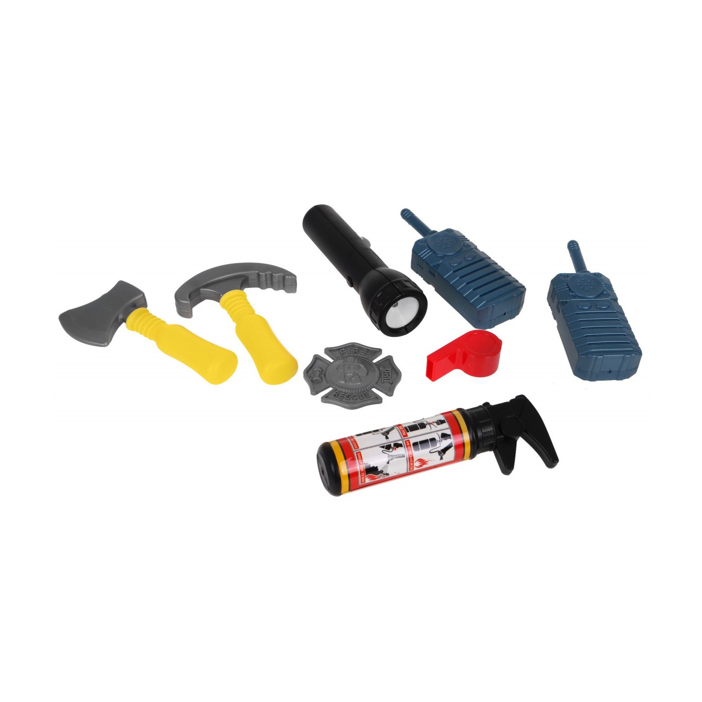 | - latarka na baterie (ok. 12 cm x 4 cm), - gwizdek (ok. 4,5 cm x 2 cm), - gaśnica (ok. 12 cm x 3 cm) - 2 x krótkofalówka (ok. 12,5 cm x 4 cm), - odznaka o średnicy ok. 6 cm, - kilof i siekierka (ok. 10 cm x 5 cm). | |