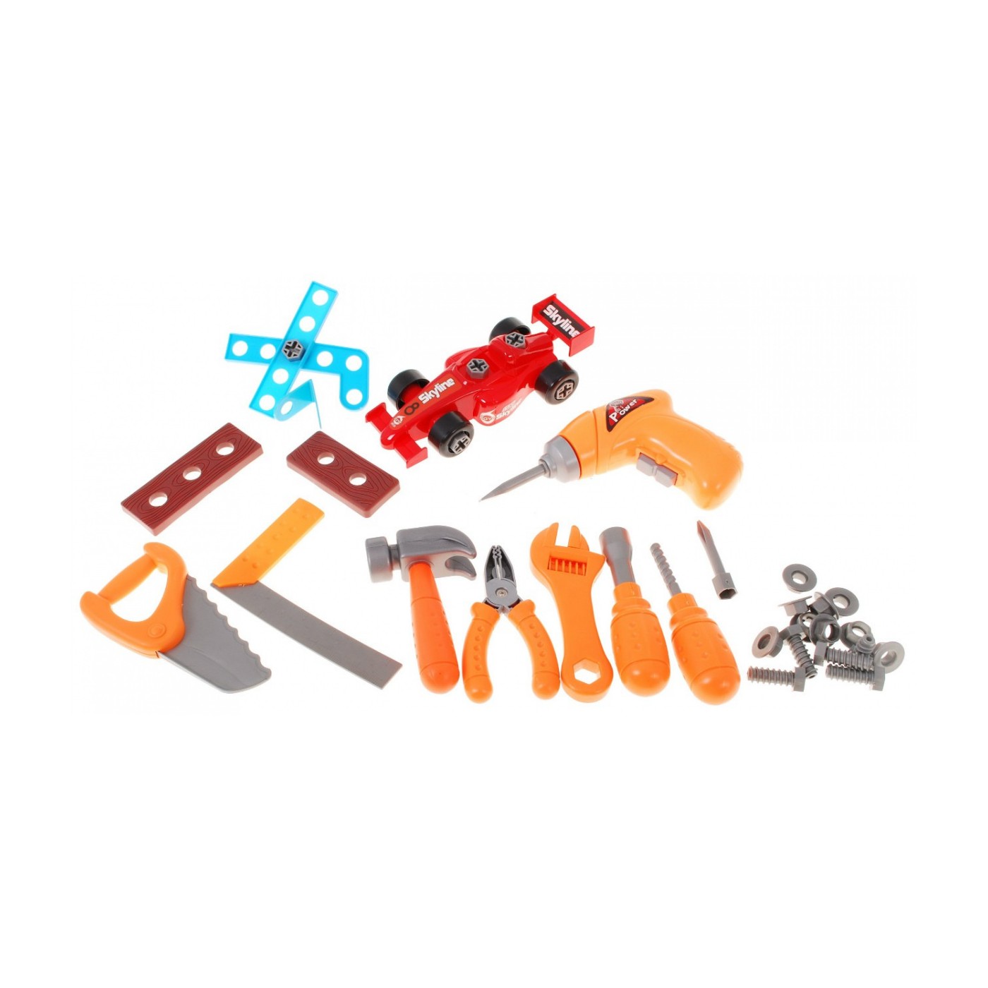 | - wiertarka zasilana na baterie (2x1,5V brak w zestawie), - młotek, - kombinerki, - klucz francuski, - piła, - klucz nasadowy, - suwmiarka, - zestaw śrub, - zestaw kątowników. | |