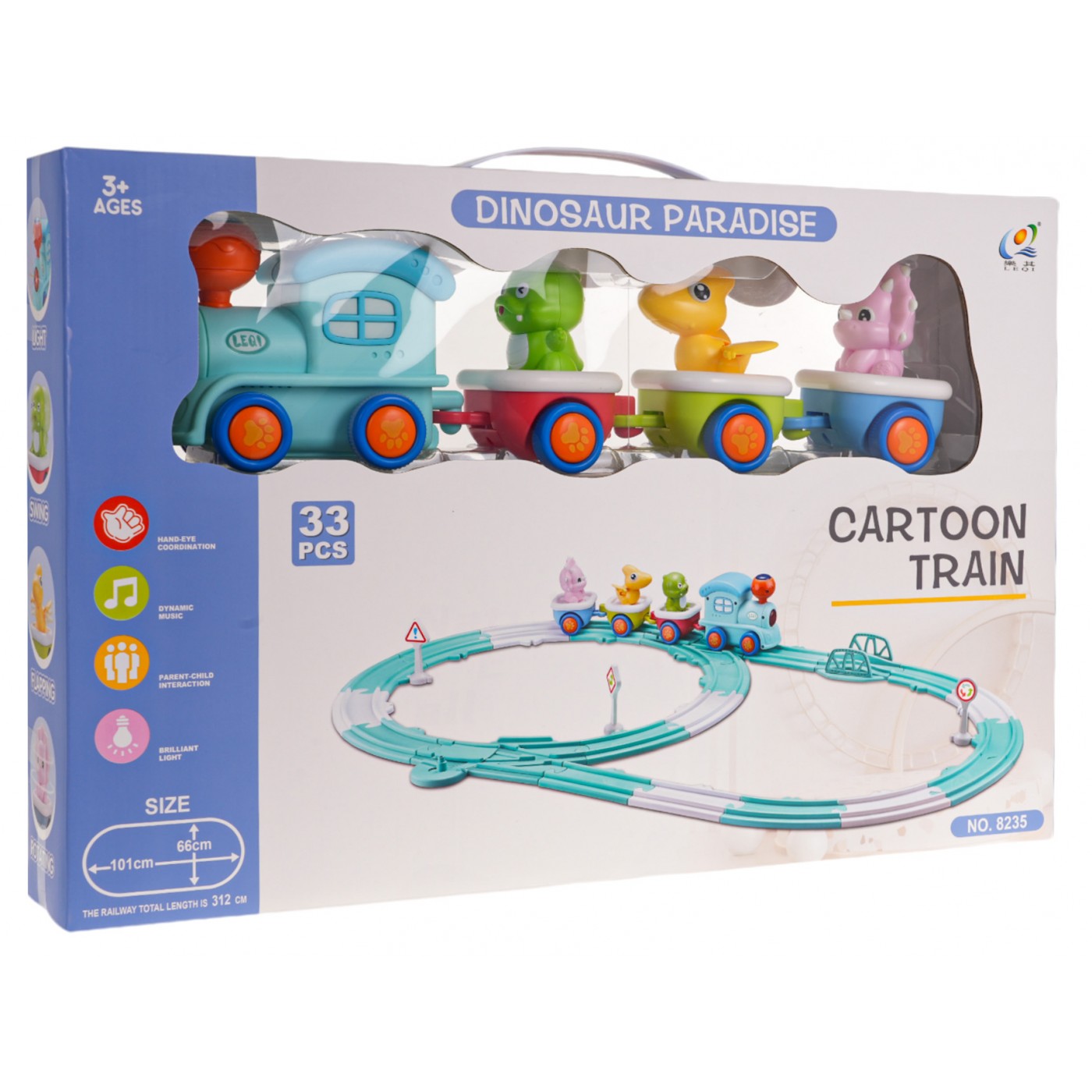 - určené pre deti od 3 rokov, - svetelná funkcia: lokomotíva navrchu a vpredu, - melódie, zvuky vydávané lokomotívou, - odpojiteľné vozne, - odnímateľné dinosaury, - 33 prvkov súpravy, - jednoduché položenie tratí. |