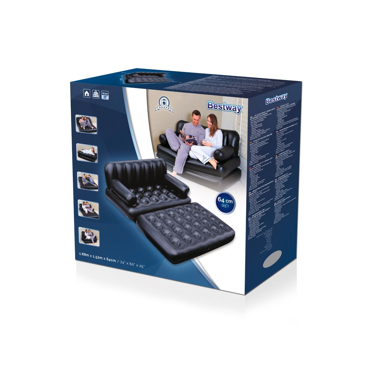 | -Wielofunkcyjny, praktyczny mebel wypoczynkowy - sofa dmuchana Bestway 5-w-1 -Wielka, dmuchana sofa Bestway 5 w 1 ma wiele zastosowań i równocześnie oferuje najwyższy komfort. -Dzięki specjalnej budowie kanapę można szybko i bez wysiłku przekształcić w dwuosobową sofę, rozkładany fotel, podwójne łóżko, wytrzymały materac. - Dzięki solidnej konstrukcji z winylu, dmuchana sofa jest odporna na uszkodzenia i wygodna. - Sofa z funkcją spania jest idealna dla 2 osób i uniesie ciężar do 300 kg. - Łóżko jest odpowiednie do użytku w pomieszczeniach. - W zestawie znajduje się specjalny futerał, który ułatwia transport i zapewnia bezpieczne przechowywanie. - W komplecie są także samoprzylepne łatki naprawcze. |