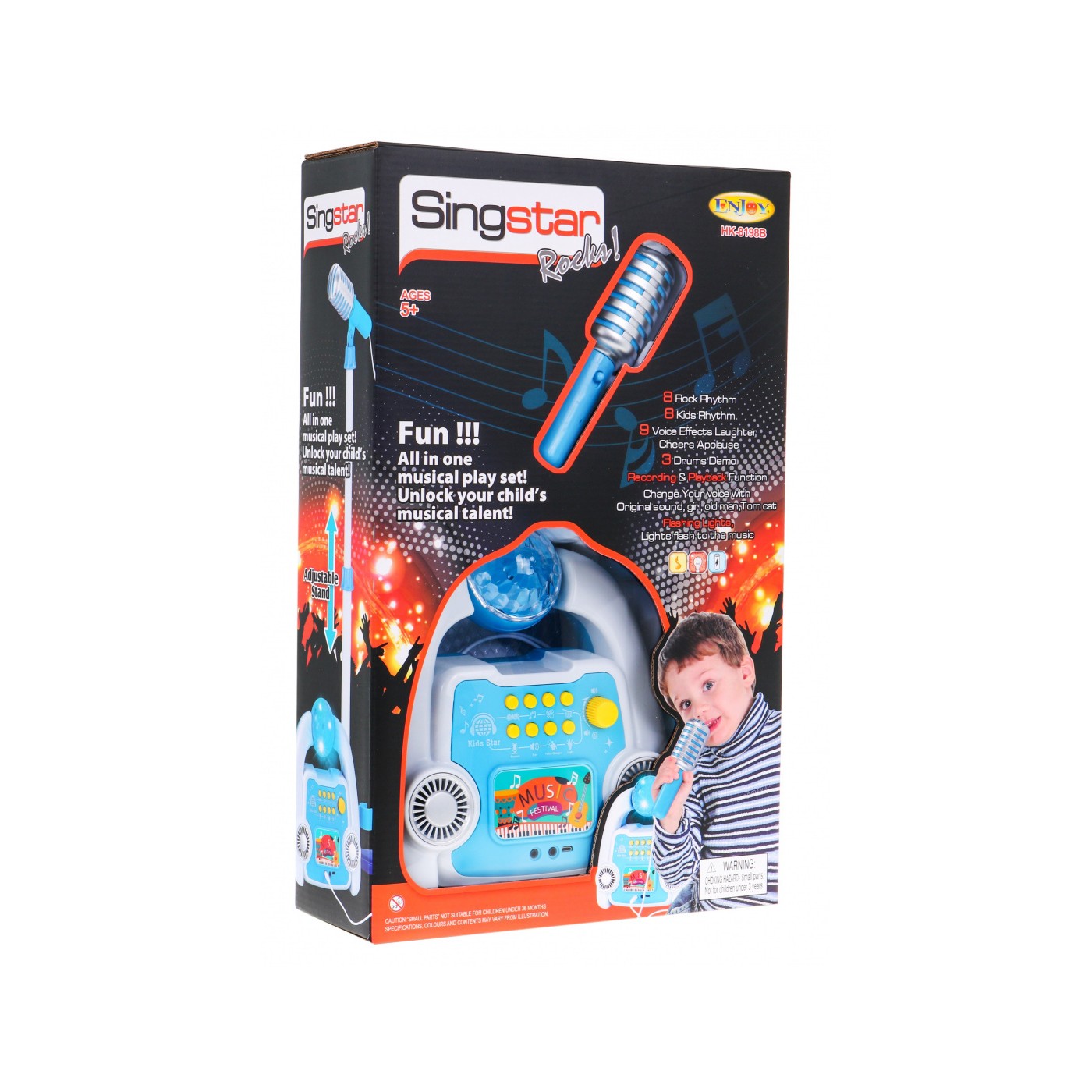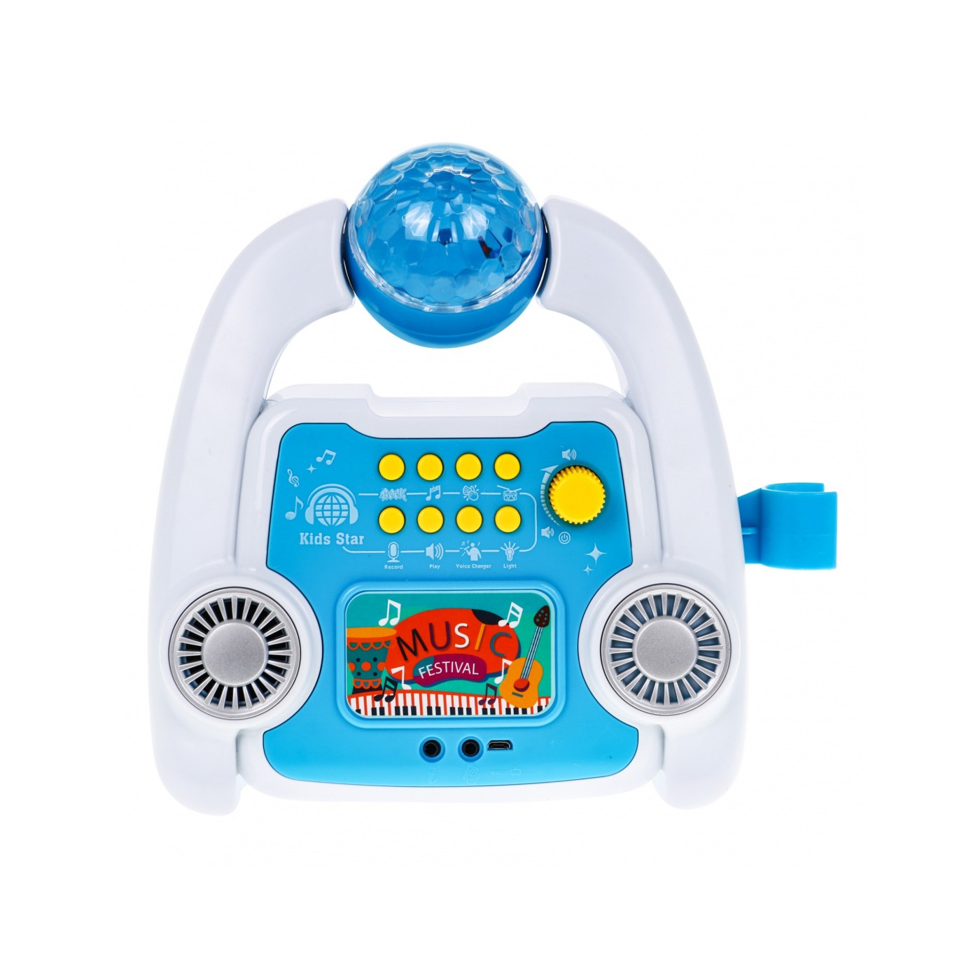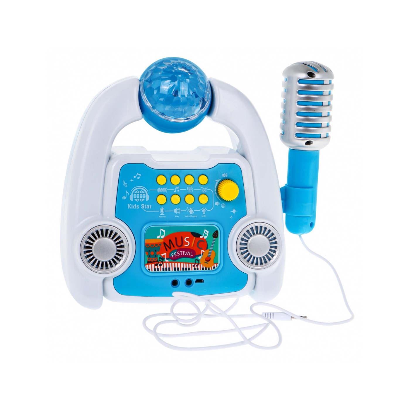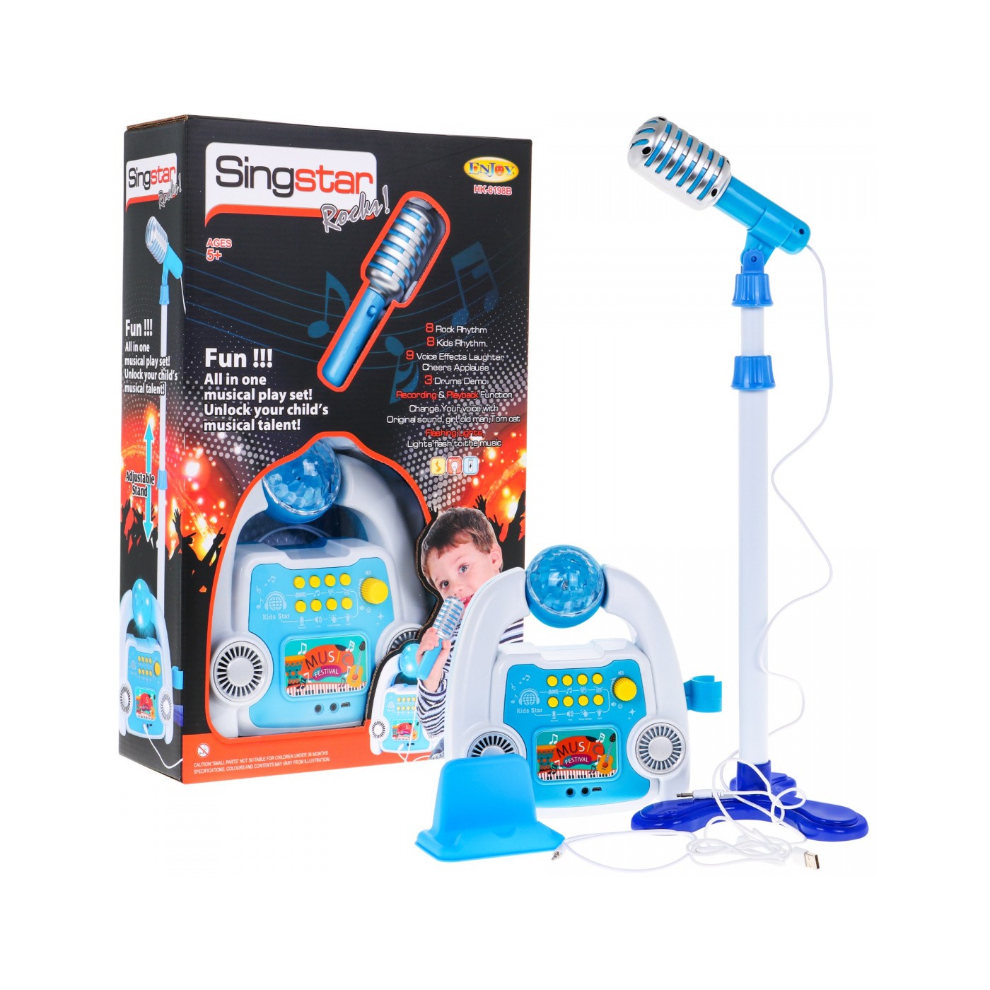 | - 8 rokowych podkładów muzycznych, - 8 piosenek dziecięcych, - 9 efektów dźwiękowych: brawa, wiwaty, śmiech, - 3 podkłady z perkusją, - nagrywanie, - odtwarzanie, - 4 efekty zmiany głosu, - efekty świetlne, - regulacja głośności, - możliwość podłączenia telefonu lub innego urządzenia USB.