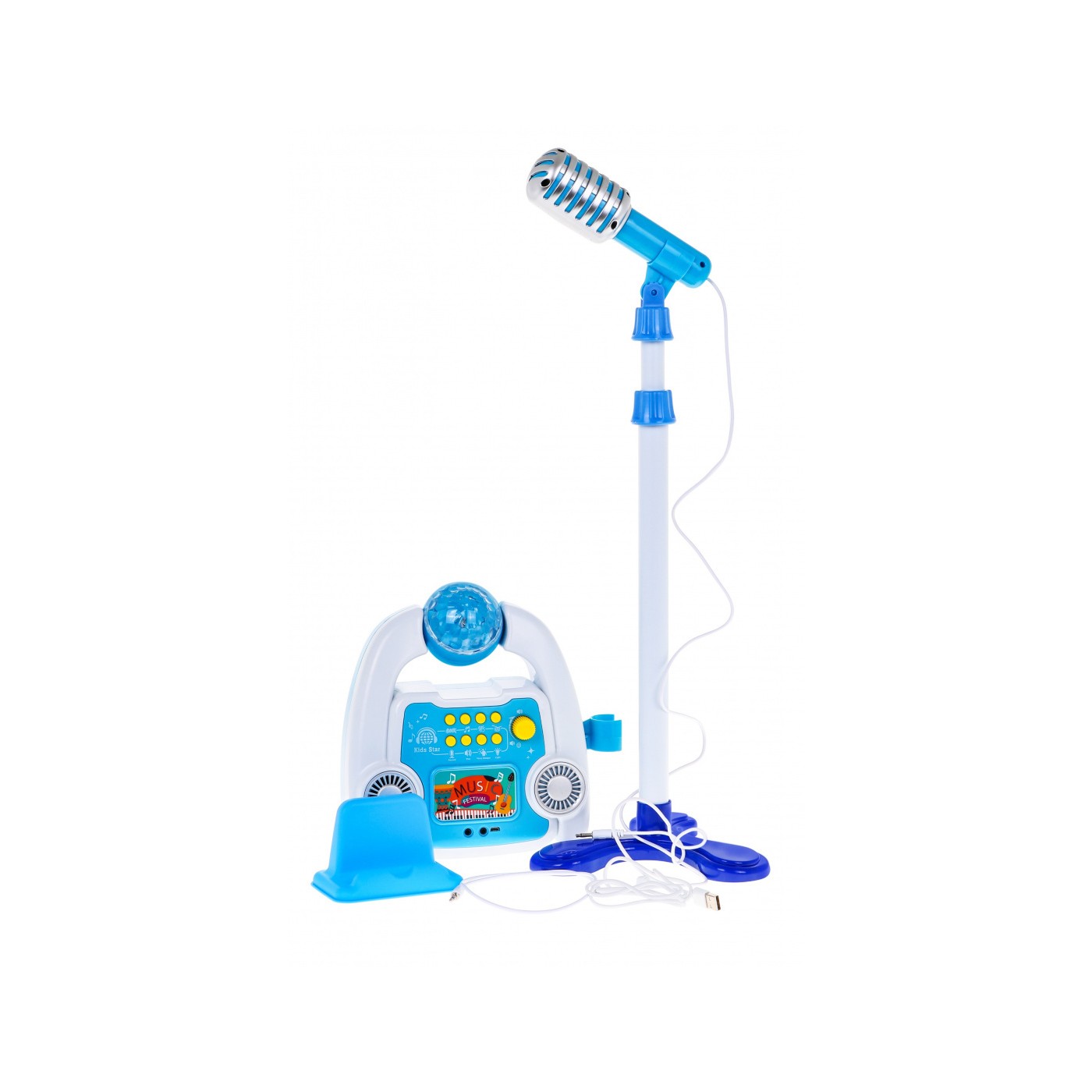 | - wzmacniacz, - mikrofon, - stojak na mikrofon, - podpórka na telefon, - kabel USB, - kabel MP3.