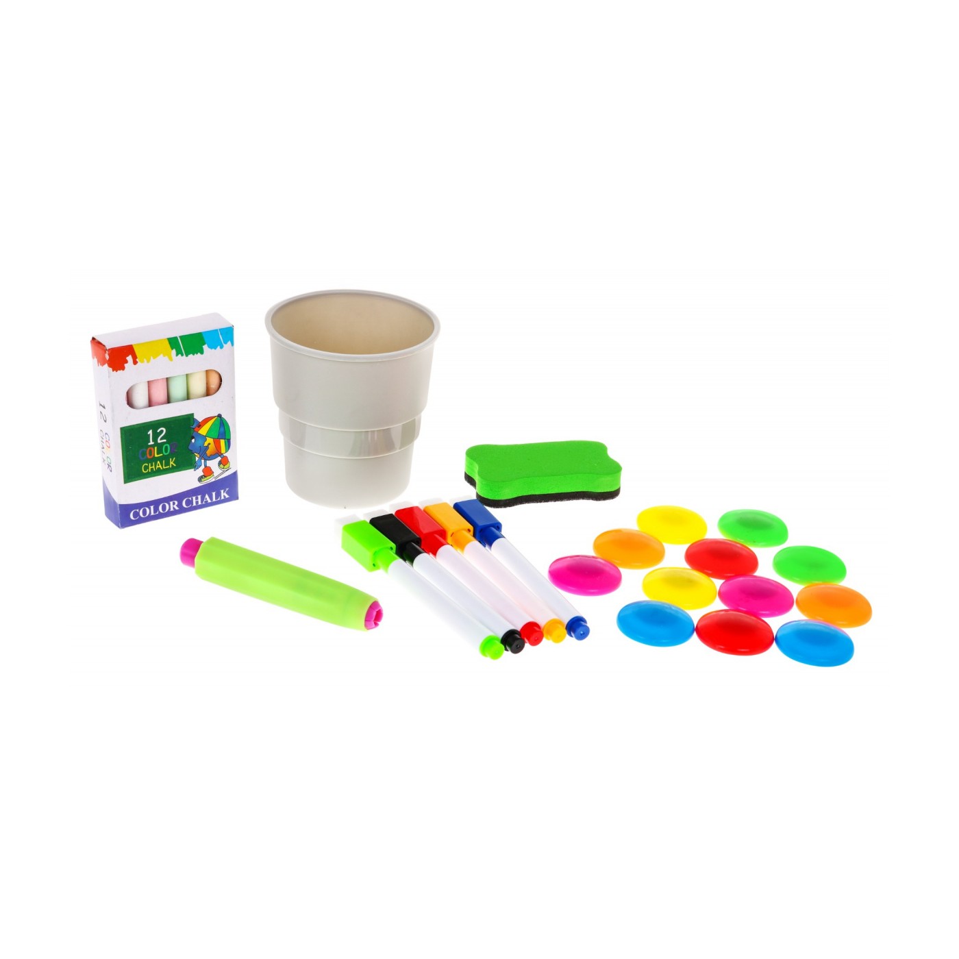 | - elementy konstrukcyjne zestawu, - przybory: kubek, pisaki, magnesy, uchwyt na kredę, kreda, gąbka. |