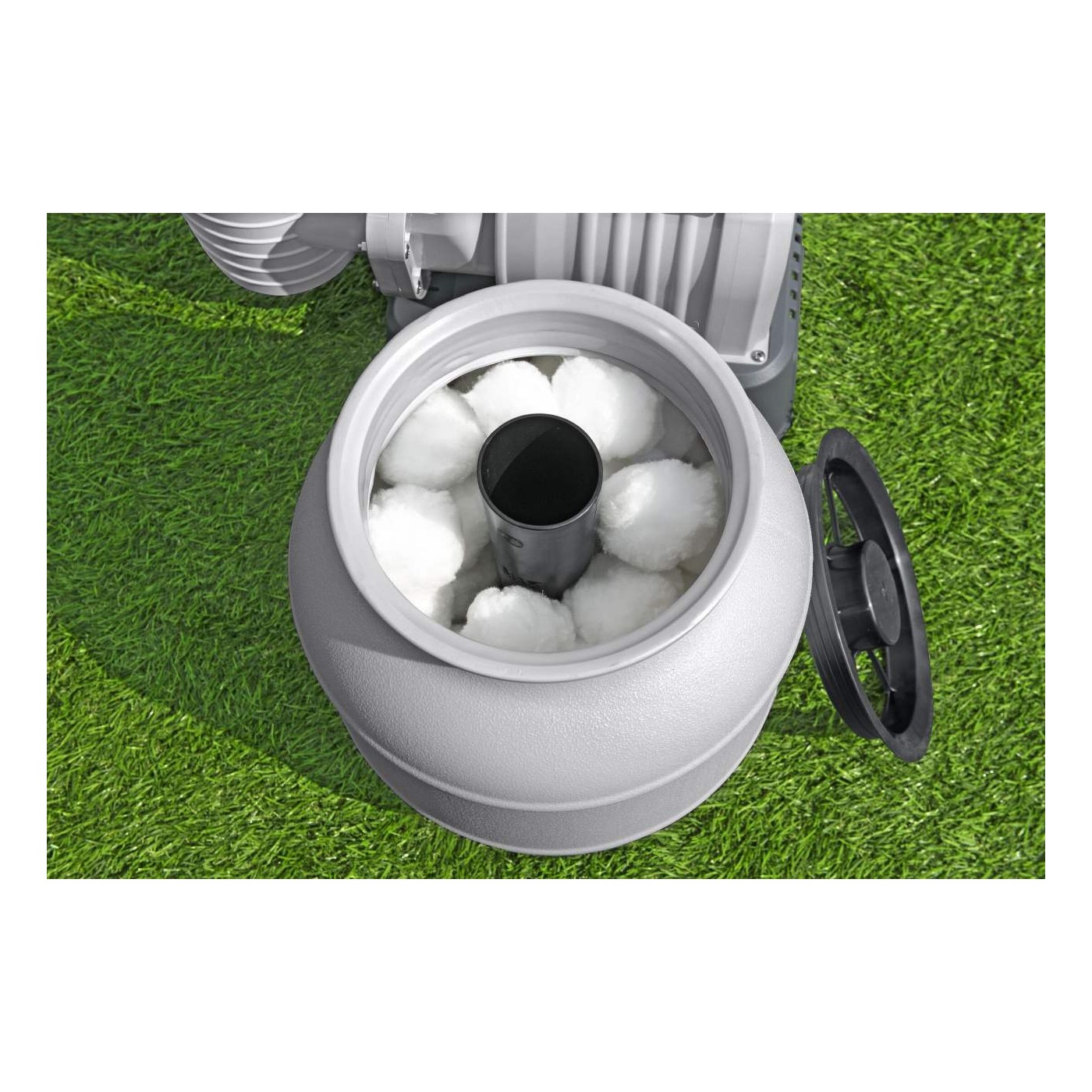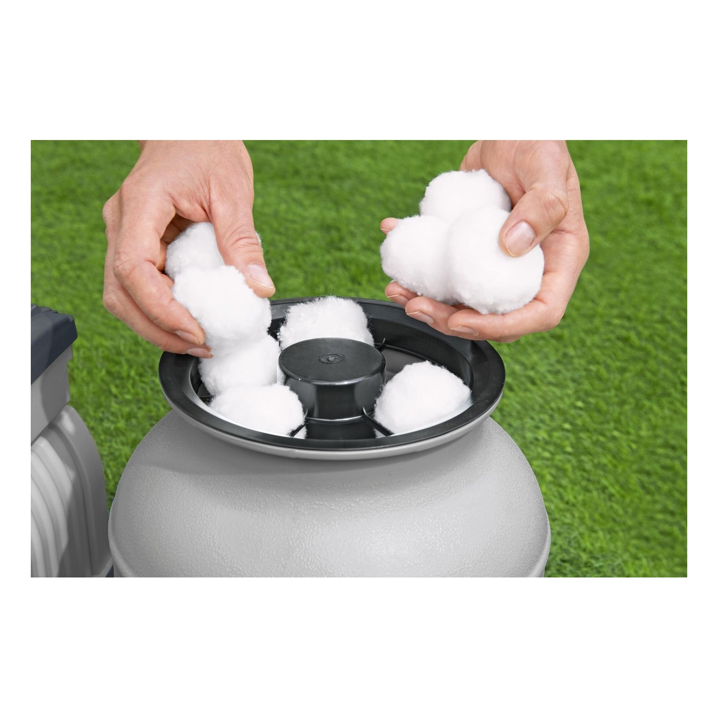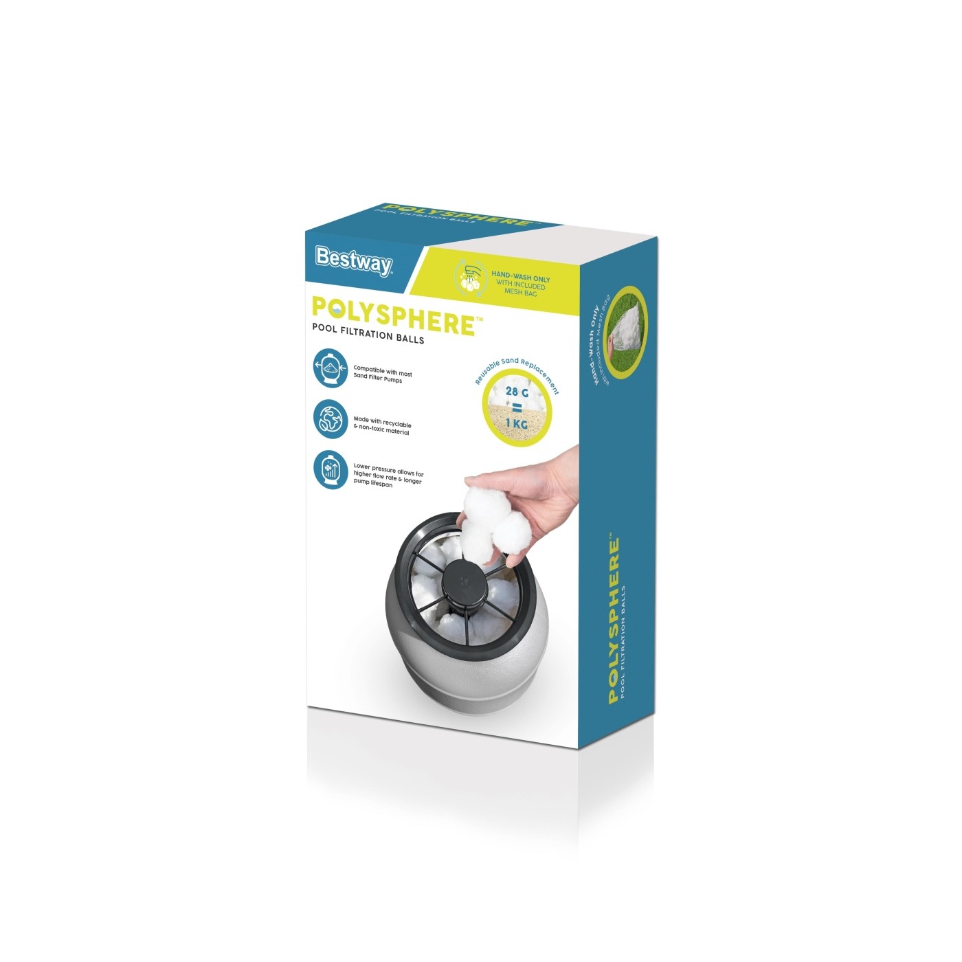 | Wkład Polysphere wykorzystujemy zamiast tradycyjnego piasku czy kruszywa. W celu wyczyszczenia wkładu filtrującego czyścimy go piorąc ręcznie (zalecane czyszczenie co 4 tygodnie). Nadaje się do wszystkich pomp piaskowych Bestway. Średnica jednej kulki filtracyjnej to około 5 cm. Jedno opakowanie 500g zastępuje 18kg tradycyjnego piasku (28g zastępuje 1kg piasku). |