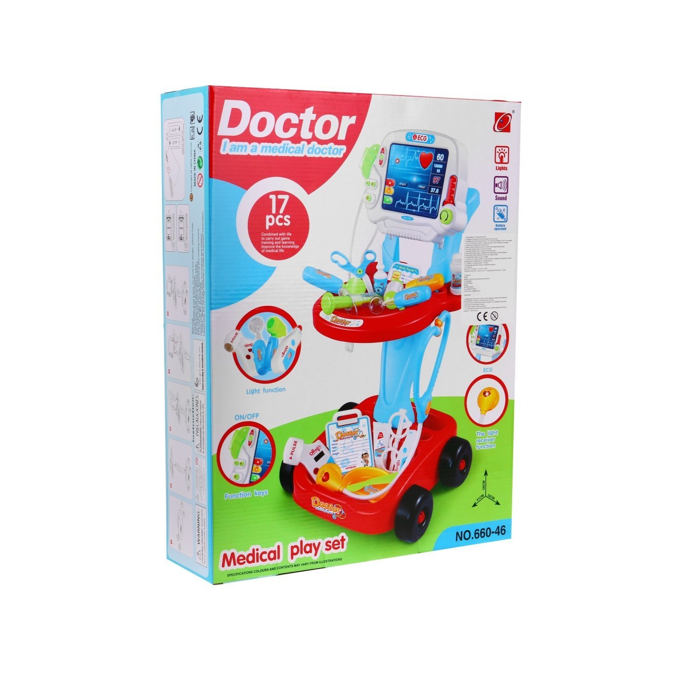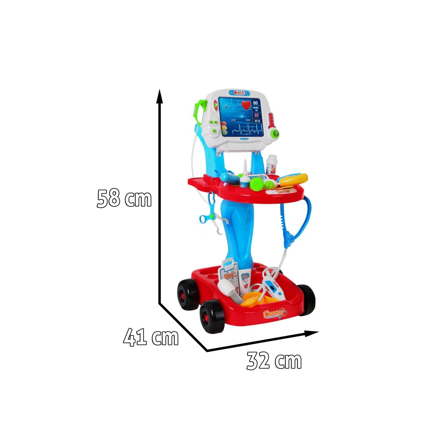 | Wyposażenie zestawu: - wózek na akcesoria z półeczkami i aparatem EKG, - stetoskop, który wydaje dźwięk bijącego serca oraz świeci się na nim serduszko po dotknięciu do ciała, - zestaw kolorowych naklejek, - lusterko dentystyczne z migającymi światłami (ok. 14 cm x 3,5 cm), - otoskop laryngologiczny z lampką do zaglądania do uszu i nosa dla pacjenta (ok. 13 cm x 6,5 cm) , - termometr z podświetlanym wynikiem i możliwością regulacji temperatury (ok. 11,5 cm x 3 cm), - strzykawka (ok. 14 cm x 6,5 cm), - pulsometr z podświetlanym wynikiem (ok. 12 cm x 5 cm), - młotek neurologiczny (ok. 13 cm x 6,5 cm), - okulary, - skalpel (ok. 12 cm x 2,5 cm), - 2 x nożyczki (ok. 12 cm x 7 cm), - wzór recepty (ok. 12,5 cm x 9 cm), - plakietka identyfikacyjna (ok. 7,5 cm x 5 cm), - nerka na lekarstwa (ok. 12 cm x 7,5 cm x 2 cm), - imitacja pojemniczka z lekarstwami (ok. 6,5 cm x 3,5 cm), - imitacja kropli do oczów (ok. 9 cm x 2,5 cm), - imitacja pasty (ok. 9 cm x 4 cm), - kroplówka. | |