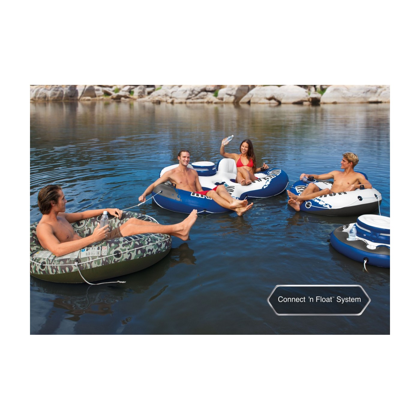 | - siateczkowe dno, - wbudowane oparcia dla większego komfortu, - wbudowana chłodziarka, - linka ze złączką umożliwiającą połączenie z innymi kółkami, - 5 komór powietrznych, - 2 wytrzymałe uchwyty, - 2 otwory na napoje, - lina wokół wyspy, | |