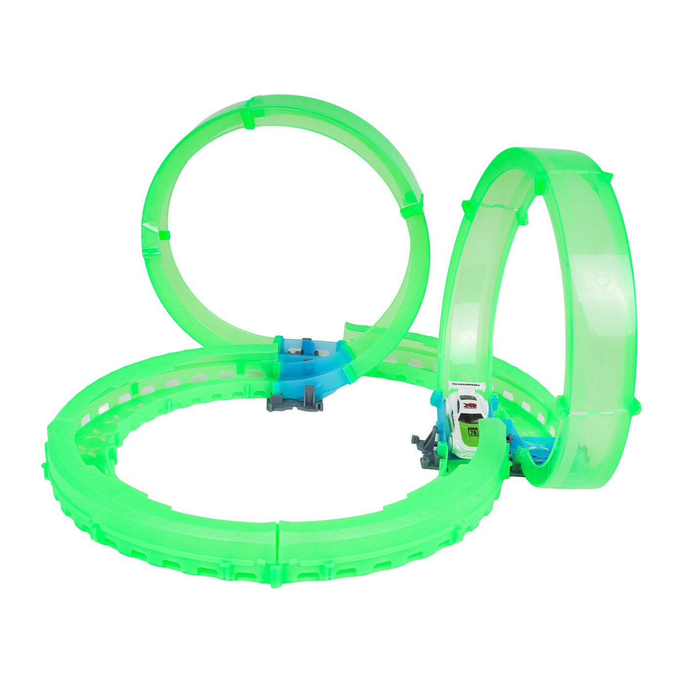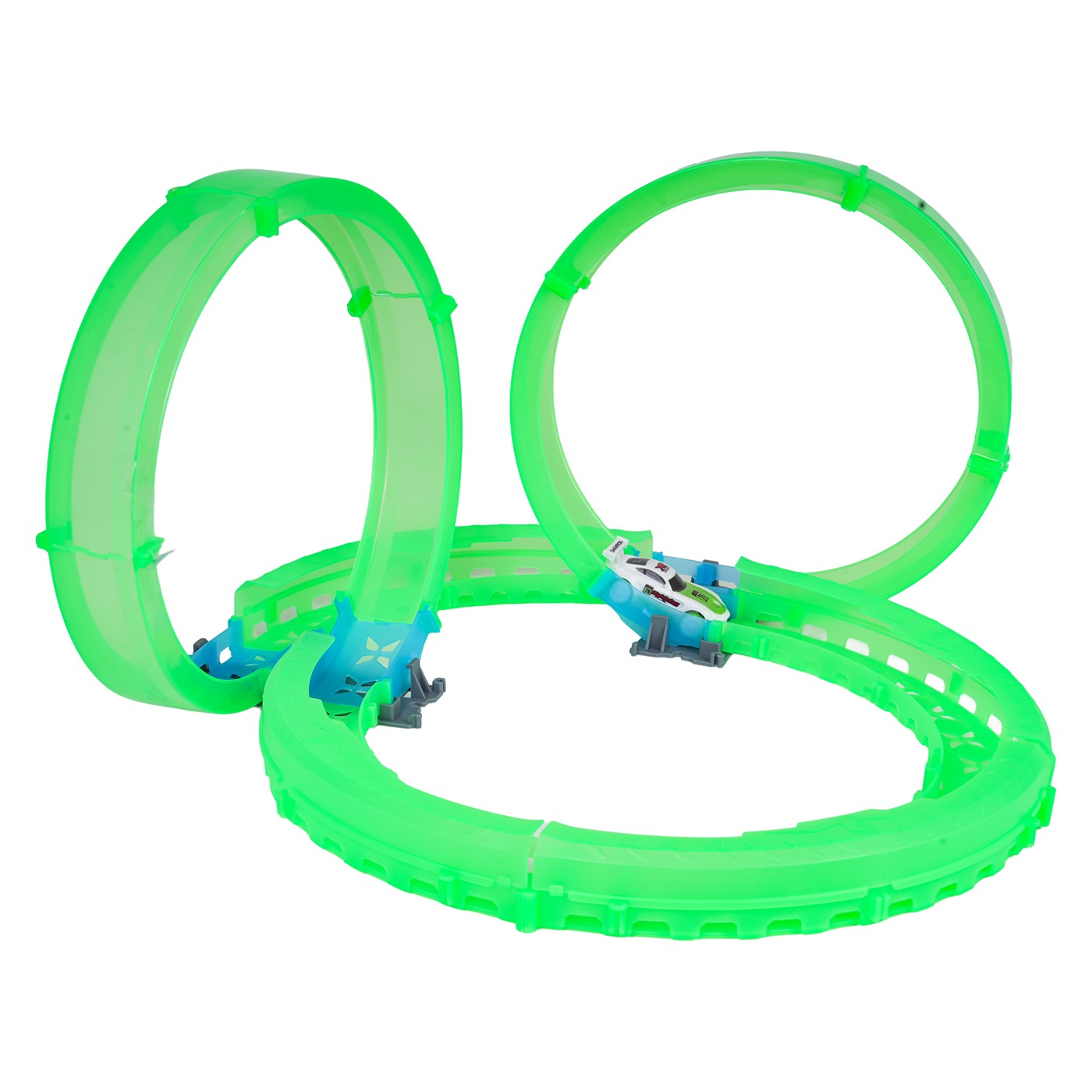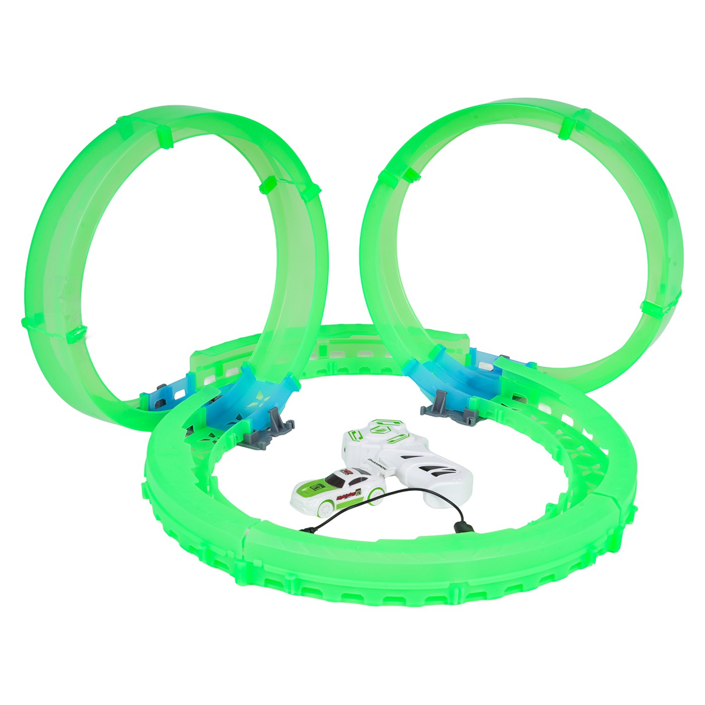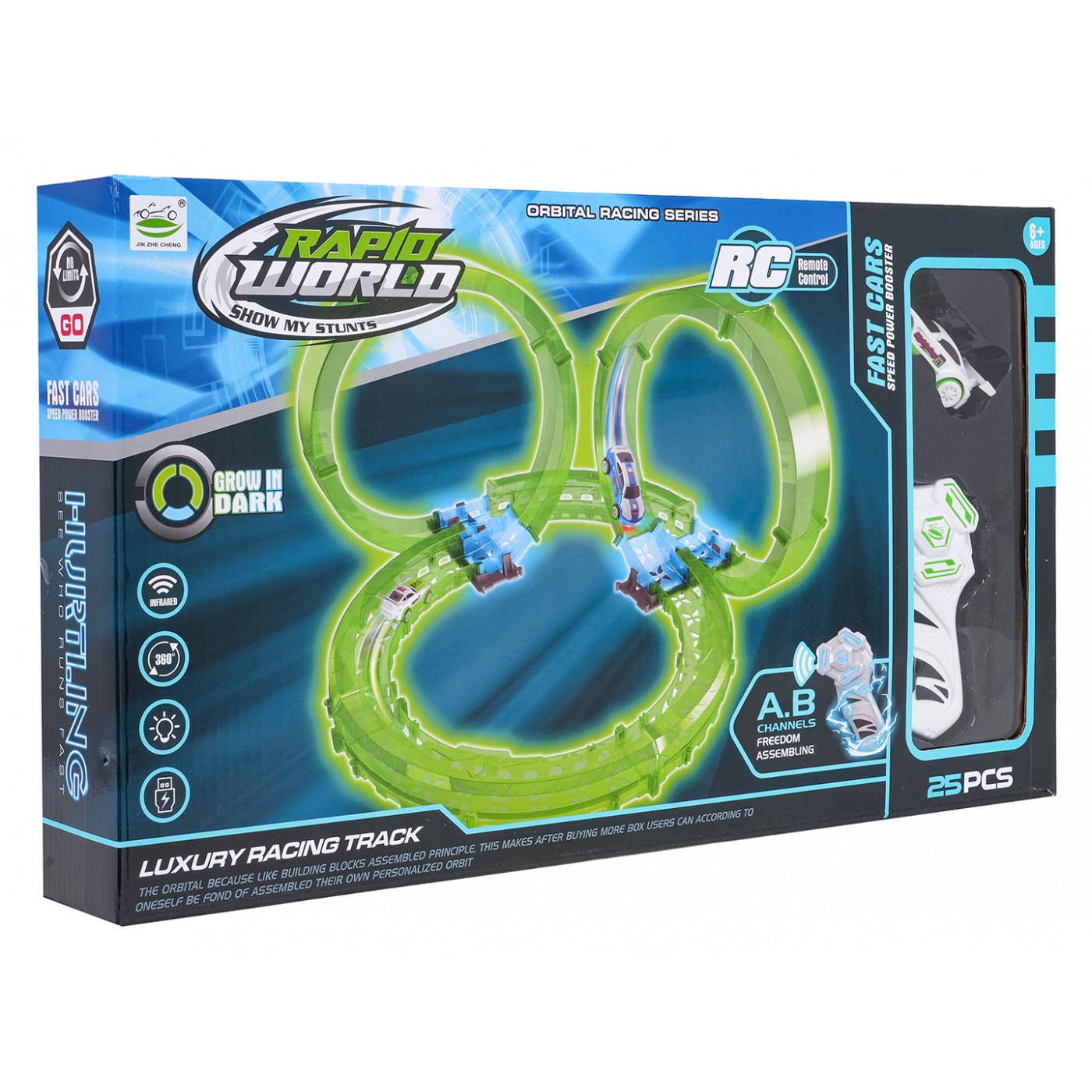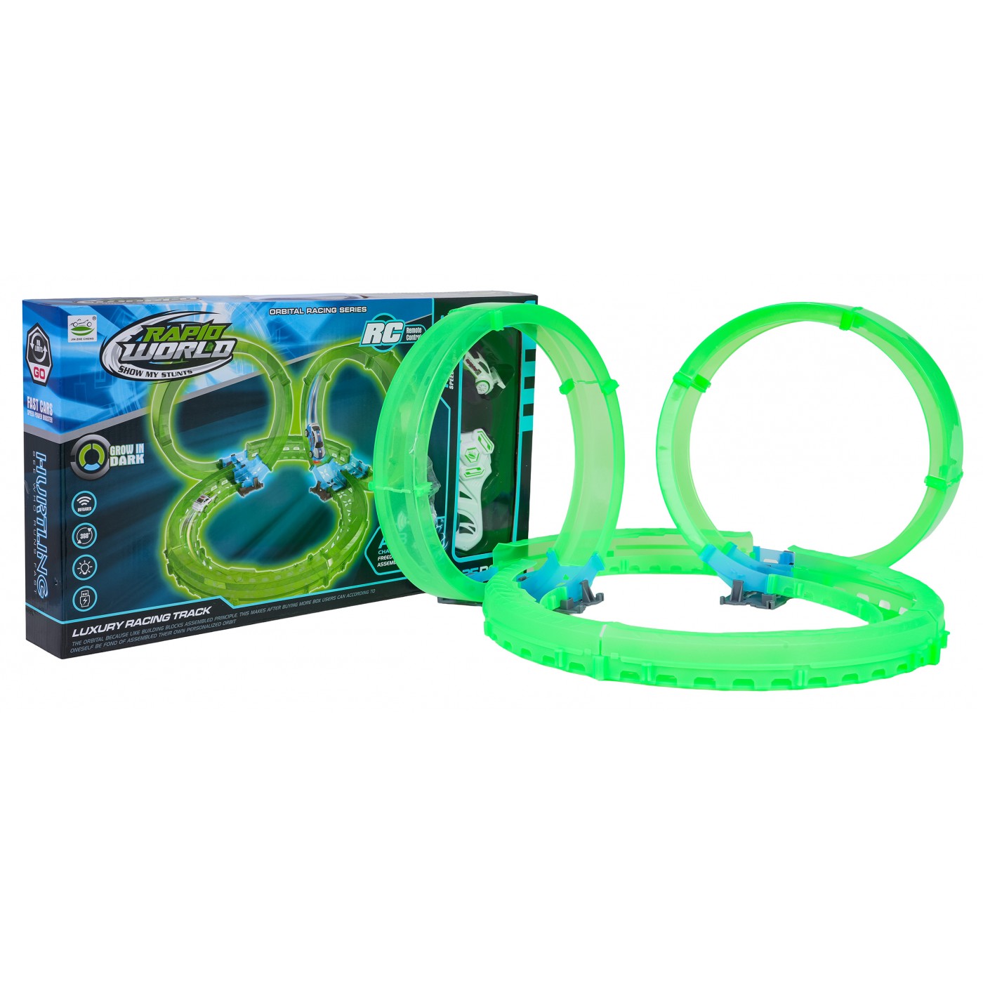 Táto veľká závodná dráha, ktorá svieti v tme, je ideálna pre deti od šiestich rokov. Sada obsahuje diaľkové ovládanie, auto a stavebné diely dráhy. Diaľkové ovládanie je napájané 2 batériami AAA (nie sú súčasťou balenia), zatiaľ čo auto je napájané 3,7 V batériou a nabíja sa pomocou USB kábla (súčasť balenia). Dráha je žiarivka a svieti v tme. Auto je vybavené LED osvetlením, ktoré pri pohybe vytvára úžasné efekty. Hra s dráhou zlepšuje koordináciu oko-ruka, zatiaľ čo stavanie dráhy stimuluje detskú predstavivosť a rozvíja manuálnu zručnosť.