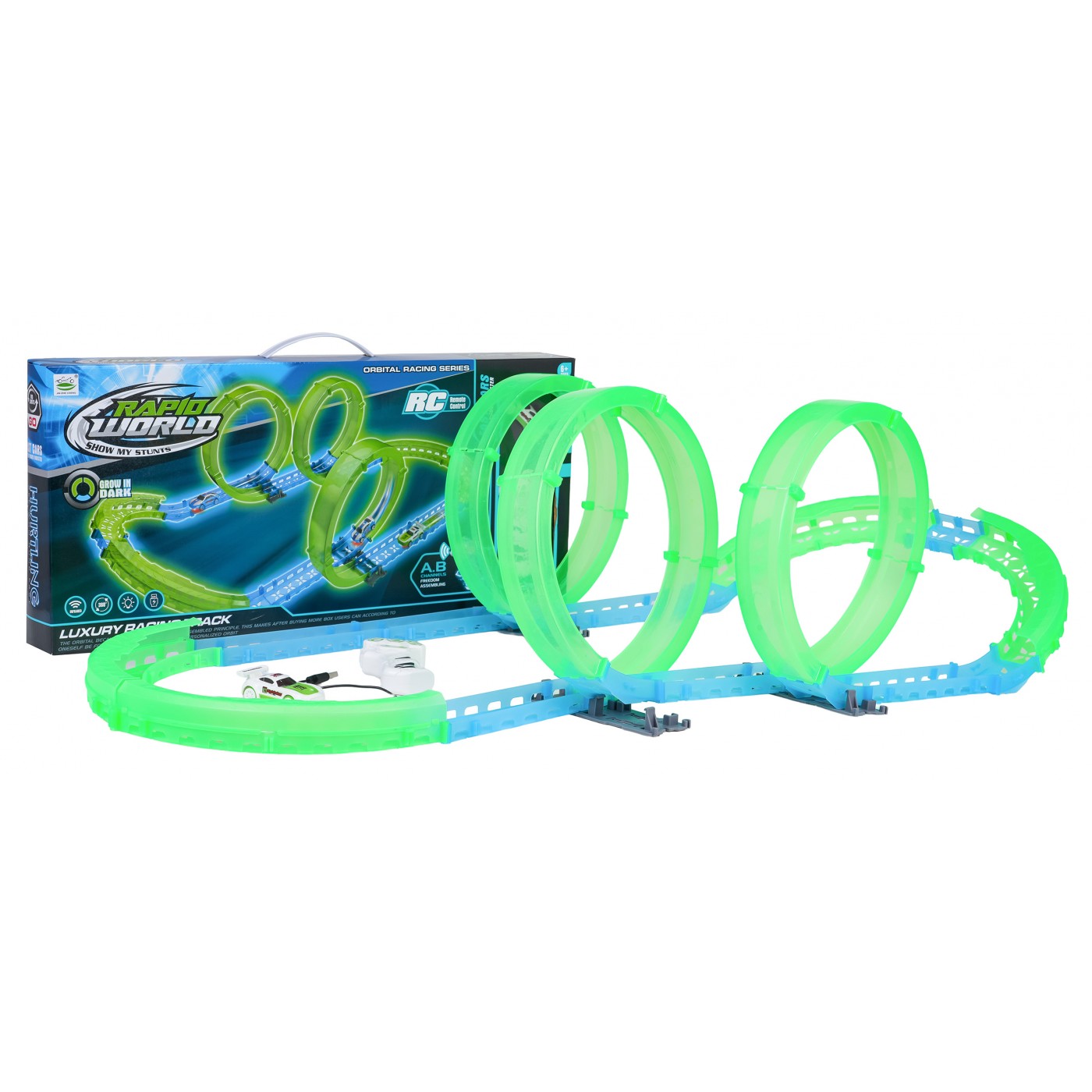 Táto veľká závodná dráha, ktorá svieti v tme, je ideálna pre deti od šiestich rokov. Sada obsahuje diaľkové ovládanie, auto a stavebné diely dráhy. Diaľkové ovládanie je napájané 2 batériami AAA (nie sú súčasťou balenia), zatiaľ čo auto je napájané 3,7 V batériou a nabíja sa pomocou USB kábla (súčasť balenia). Dráha je žiarivka a svieti v tme. Auto je vybavené LED osvetlením, ktoré pri pohybe vytvára úžasné efekty. Hra s dráhou zlepšuje koordináciu oko-ruka, zatiaľ čo stavanie dráhy stimuluje detskú predstavivosť a rozvíja manuálnu zručnosť.