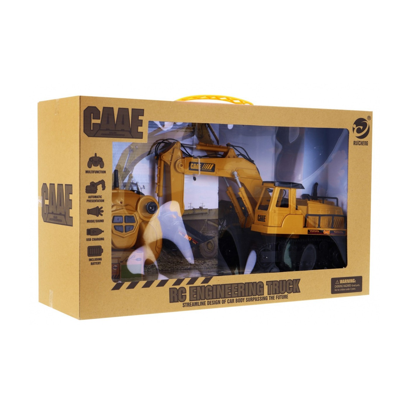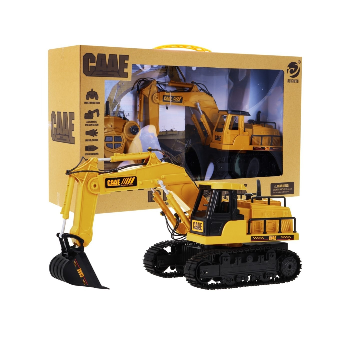| | Koparka, to marzenie każdego młodego budowniczego. Solidne wykonanie, żywe kolory, wysoka jakość plastiku. Pojazd jeździ do tyłu, do przodu, skręca w prawo i w lewo. Podczas jazdy słychać odgłosy pracy maszyny. Przy jeździe do tyłu słychać alarm biegu wstecznego. Ruchome i obrotowe ramię koparki (360 stopni) kiper, góra i dół, obsługiwane z pilota. Dźwięk klaksonu, skoczna muzyczka. Koparka działa na falach 2,4 GHZ. Zabawka jest przeznaczona od 3-go roku życia i posiada certyfikat CE. Ekologiczne opakowanie typu „walizka” z rączką do przenoszenia. |