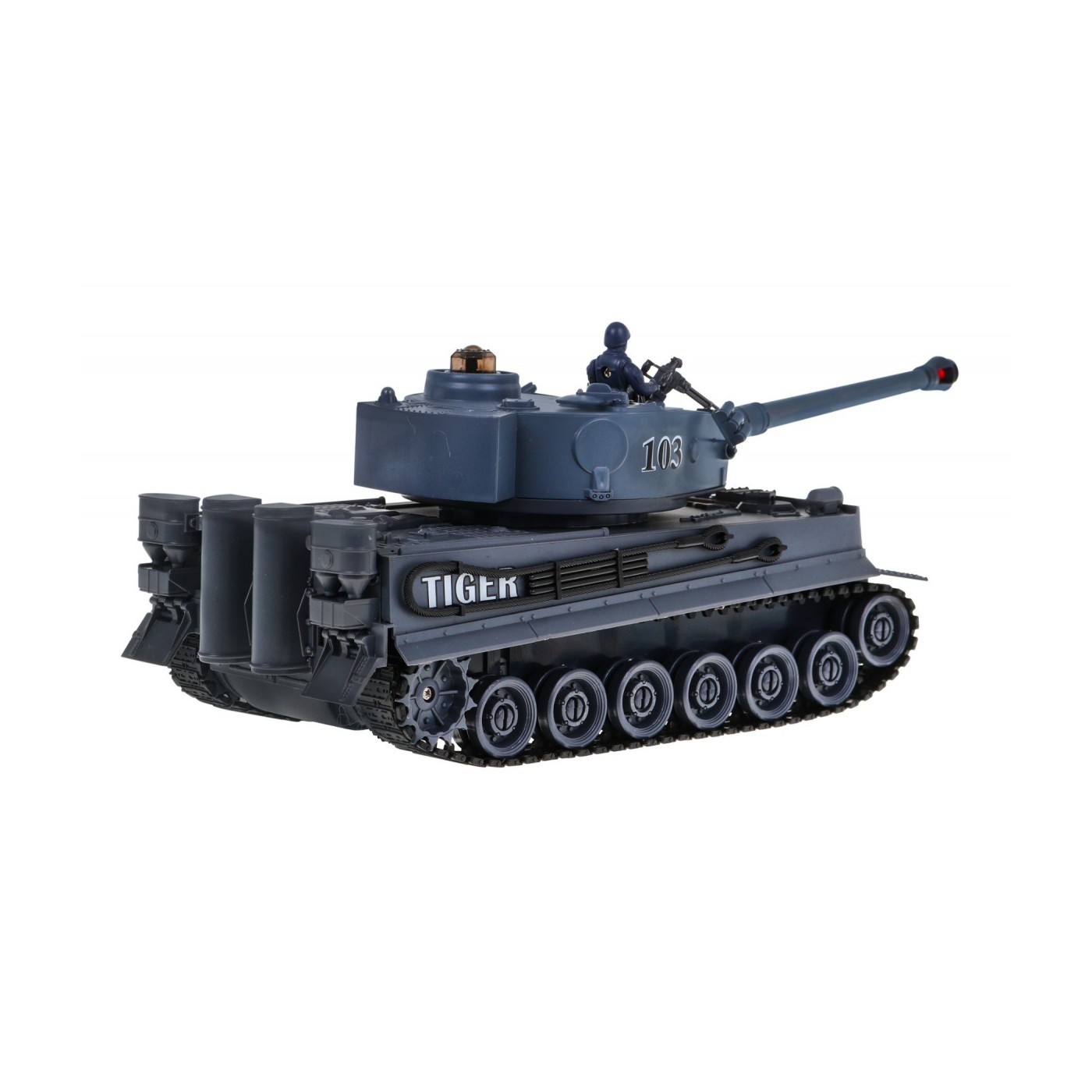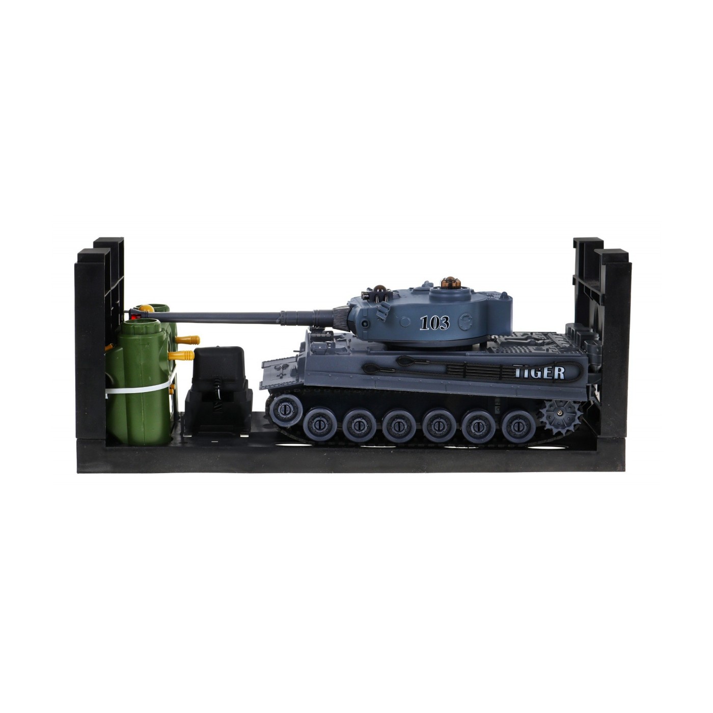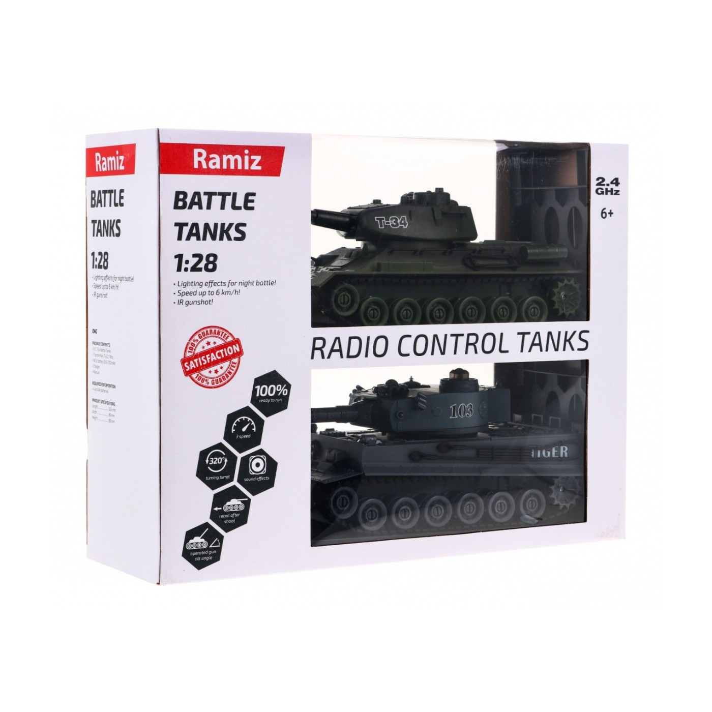 | Czołgi o częstotliwość 2.4 GHz, dzięki czemu w tym samym czasie możliwe jest kierowanie pojazdami przez wielu graczy. Czołg zasilany jest akumulatorkiem wielokrotnego ładowania. Bateria do pilota, jak i ładowarka, jest dołączona do zestawu. Obrotowa wieżyczka wyposażona jest w lufę z systemem podczerwieni. Po wycelowaniu i oddaniu celnego strzału w kierunku drugiego pojazdu usłyszymy dźwięk trafionego celu. Na potwierdzenie trafienia zgaśnie jedna z trzech kontrolek na wrogim czołgu. Po trzy krotnym trafieniu, pojazd wroga zostanie unieruchomiony na 15 sekund. Bitwa została wygrana i można zacząć nową rozgrywkę od początku. Gąsienicowy układ jezdny - doskonale imituje jazdę prawdziwego czołgu. Instynktowne sterowanie czołgiem nie sprawia żadnych trudności i jest łatwe w opanowaniu już po kilku próbach. Pojazd radzi sobie z pokonywaniem przeszkód, aż do 3 cm wysokości. Realistyczny odrzut pojazdu podczas wystrzału - pojazd podczas wystrzału z działa zachowuje się jak prawdziwy czołg na polu bitwy. Otwierany właz na wieżyczce – w którym możemy umieścić czołgistę wraz karabinem maszynowym. Sterowanie - pojazdem możemy kierować do przodu, do tyłu, skręcać w prawo i w lewo, a także obracać w miejscu tak jak prawdziwym czołgiem. |