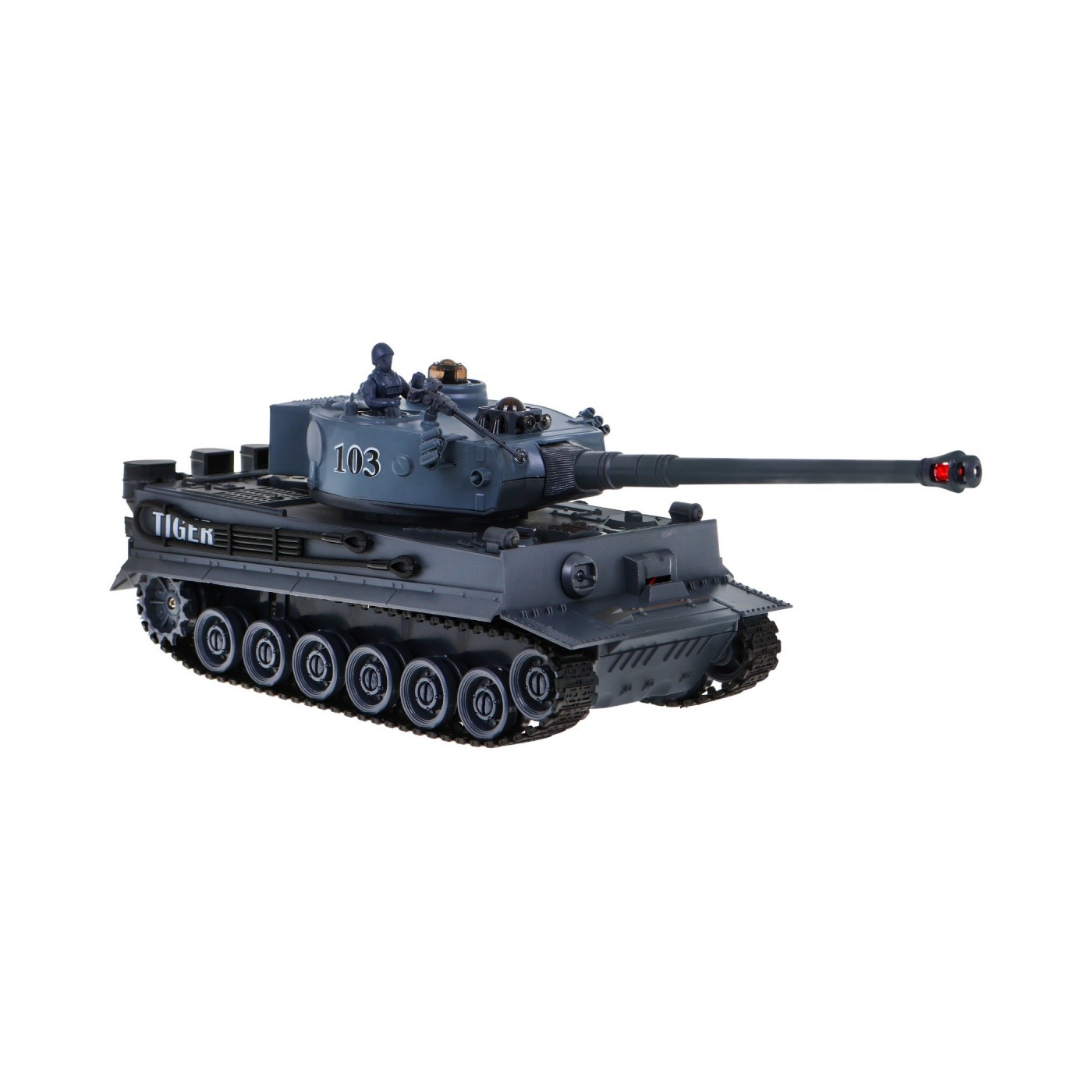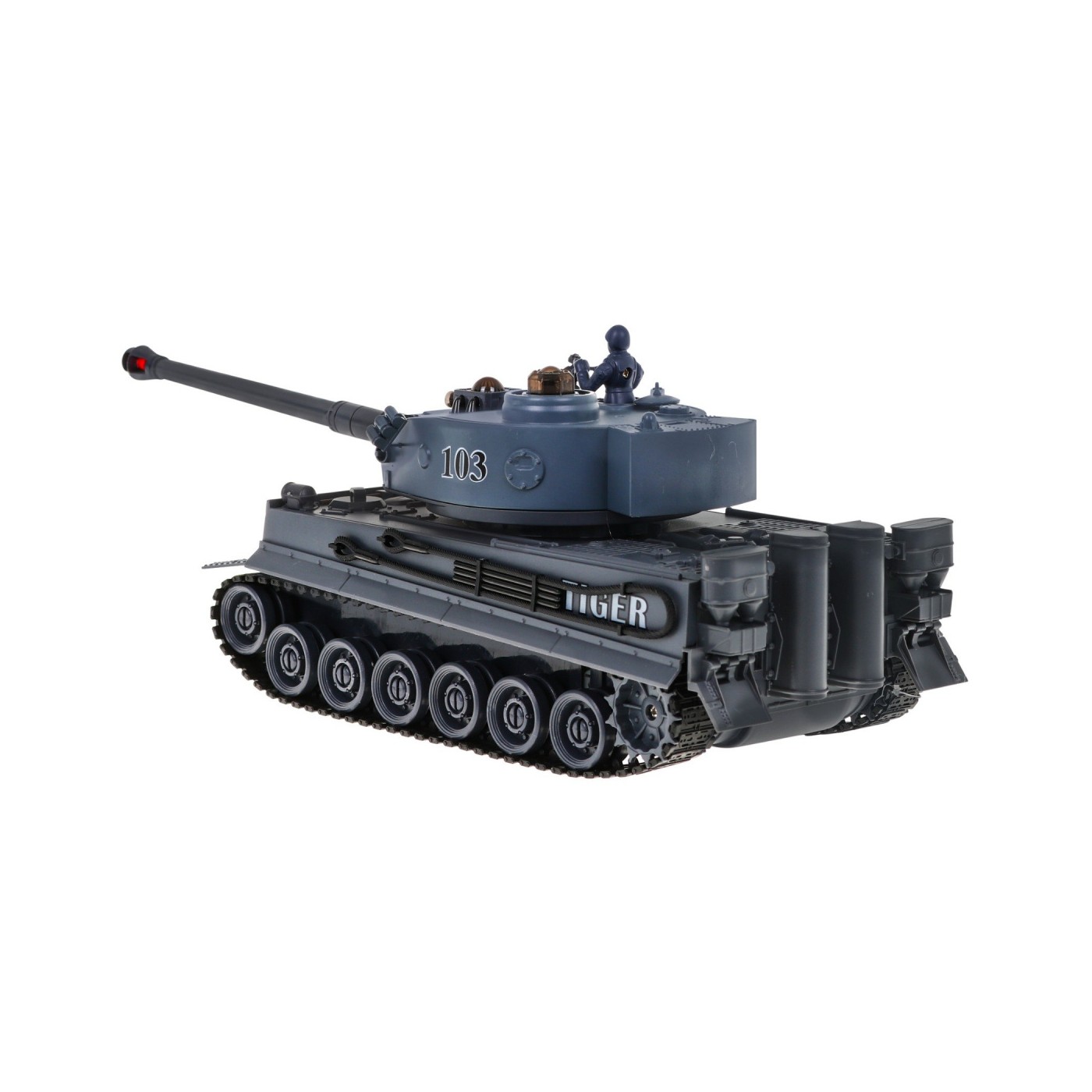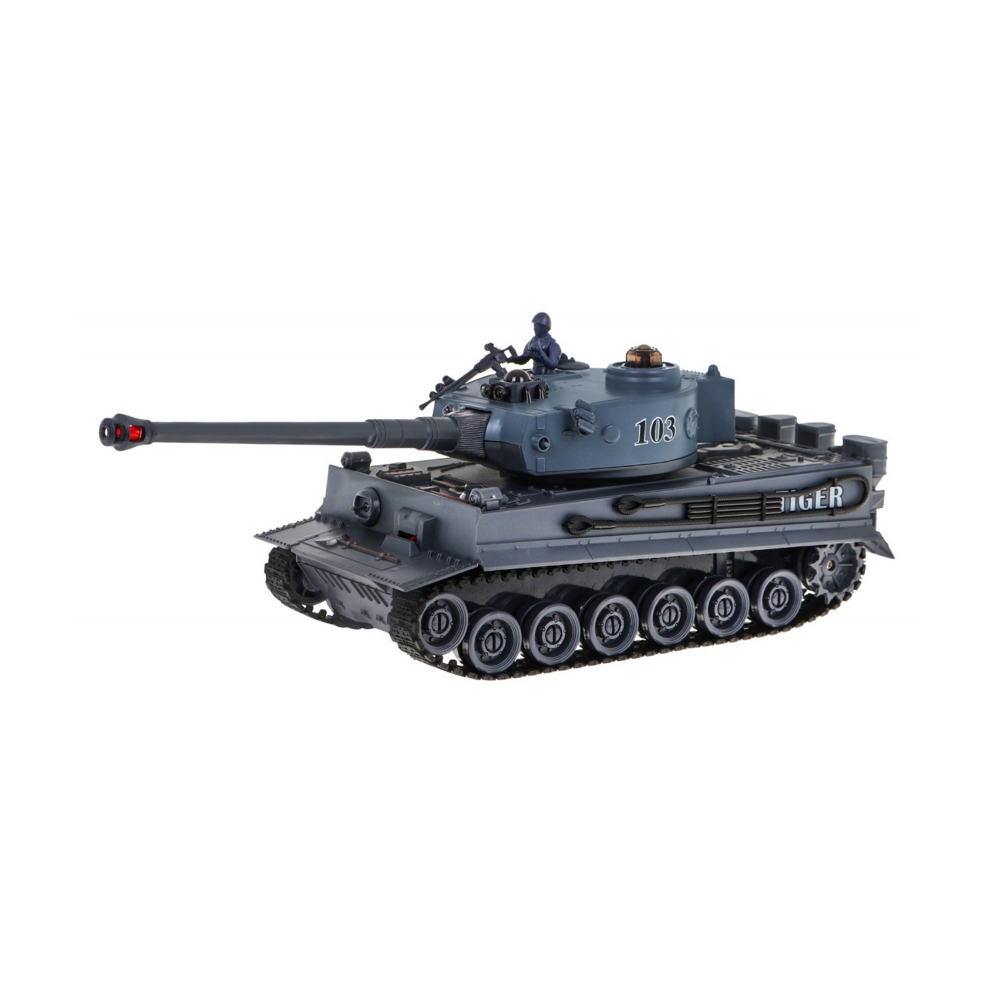 | Czołgi o częstotliwość 2.4 GHz, dzięki czemu w tym samym czasie możliwe jest kierowanie pojazdami przez wielu graczy. Czołg zasilany jest akumulatorkiem wielokrotnego ładowania. Bateria do pilota, jak i ładowarka, jest dołączona do zestawu. Obrotowa wieżyczka wyposażona jest w lufę z systemem podczerwieni. Po wycelowaniu i oddaniu celnego strzału w kierunku drugiego pojazdu usłyszymy dźwięk trafionego celu. Na potwierdzenie trafienia zgaśnie jedna z trzech kontrolek na wrogim czołgu. Po trzy krotnym trafieniu, pojazd wroga zostanie unieruchomiony na 15 sekund. Bitwa została wygrana i można zacząć nową rozgrywkę od początku. Gąsienicowy układ jezdny - doskonale imituje jazdę prawdziwego czołgu. Instynktowne sterowanie czołgiem nie sprawia żadnych trudności i jest łatwe w opanowaniu już po kilku próbach. Pojazd radzi sobie z pokonywaniem przeszkód, aż do 3 cm wysokości. Realistyczny odrzut pojazdu podczas wystrzału - pojazd podczas wystrzału z działa zachowuje się jak prawdziwy czołg na polu bitwy. Otwierany właz na wieżyczce – w którym możemy umieścić czołgistę wraz karabinem maszynowym. Sterowanie - pojazdem możemy kierować do przodu, do tyłu, skręcać w prawo i w lewo, a także obracać w miejscu tak jak prawdziwym czołgiem. |