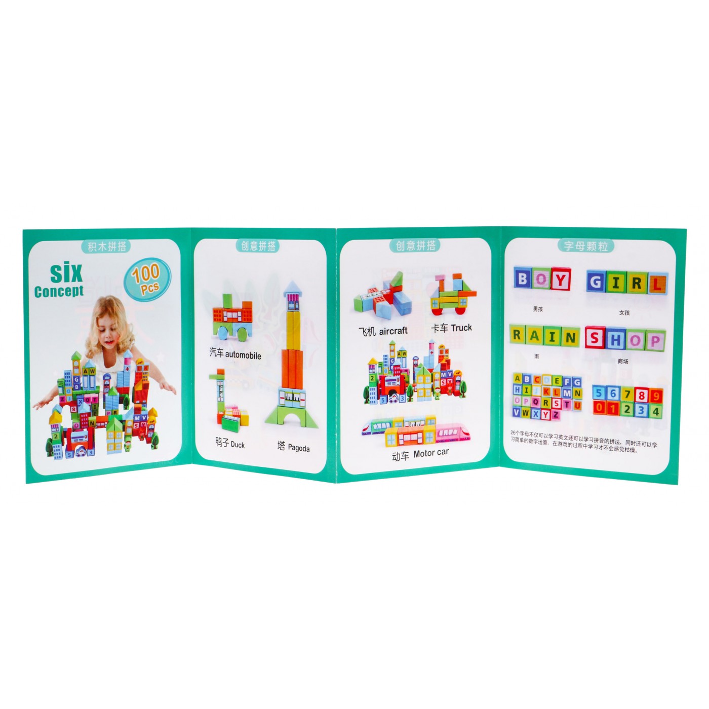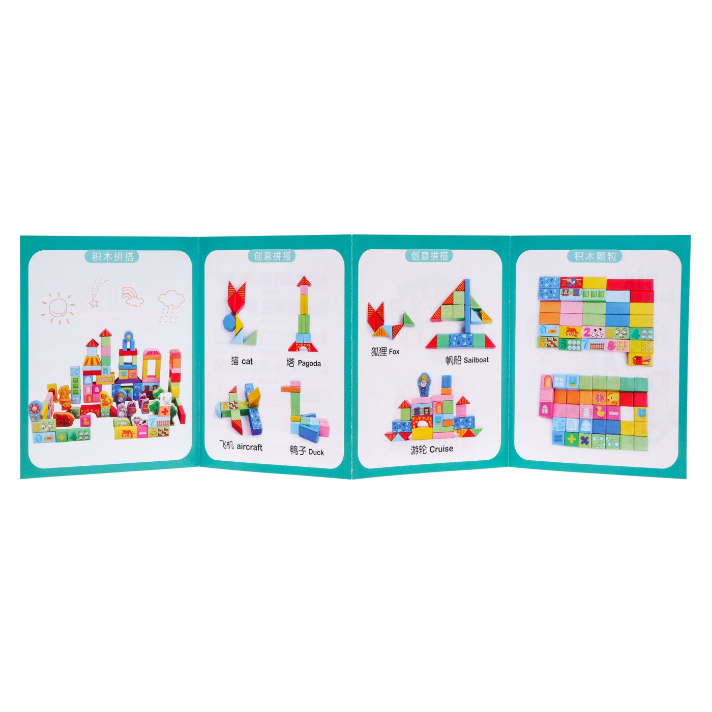 | - 100 drewnianych klocków o różnych kolorach i kształtach, - obrazkowa instrukcja. |