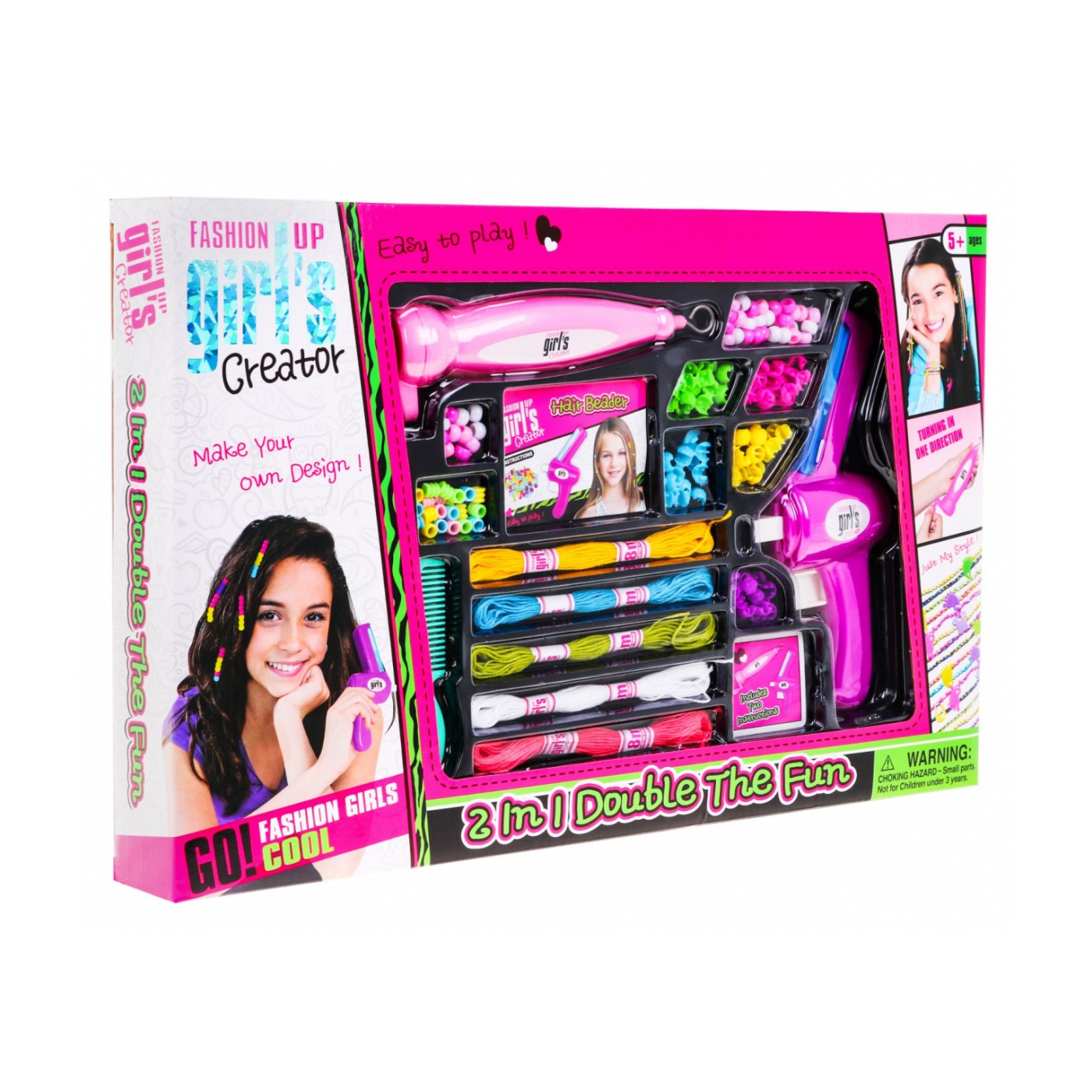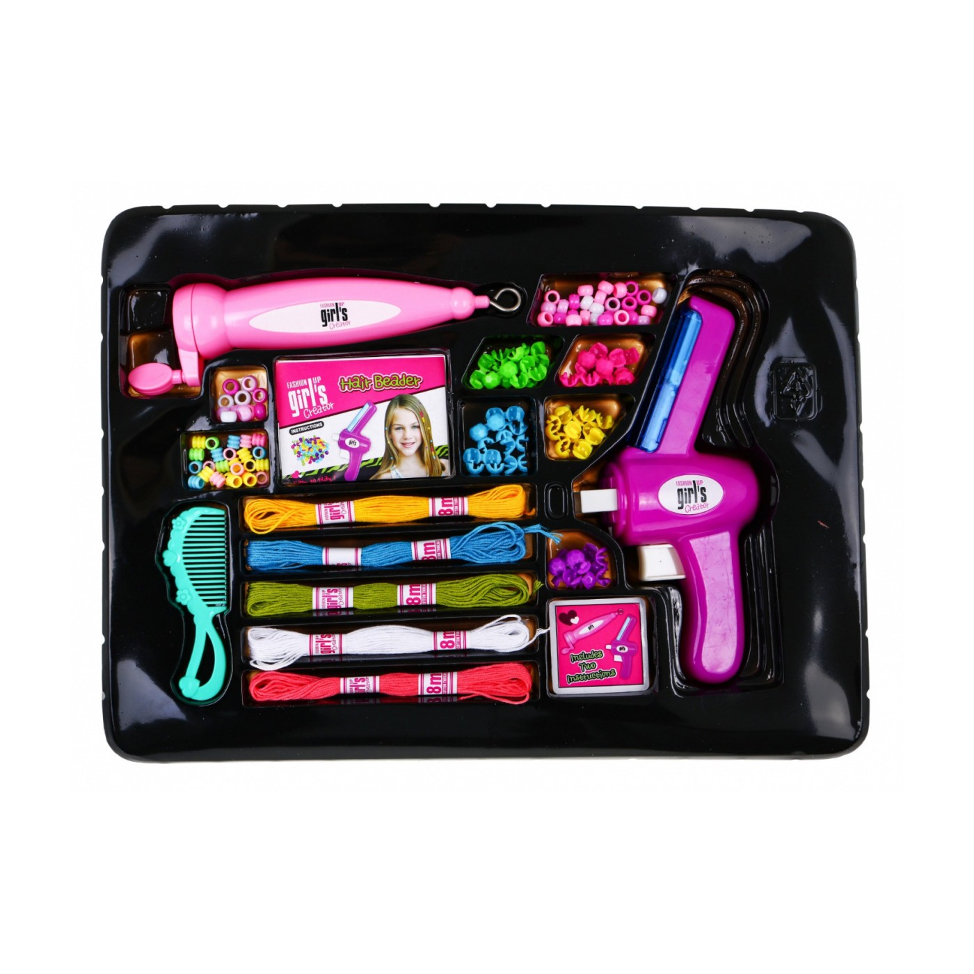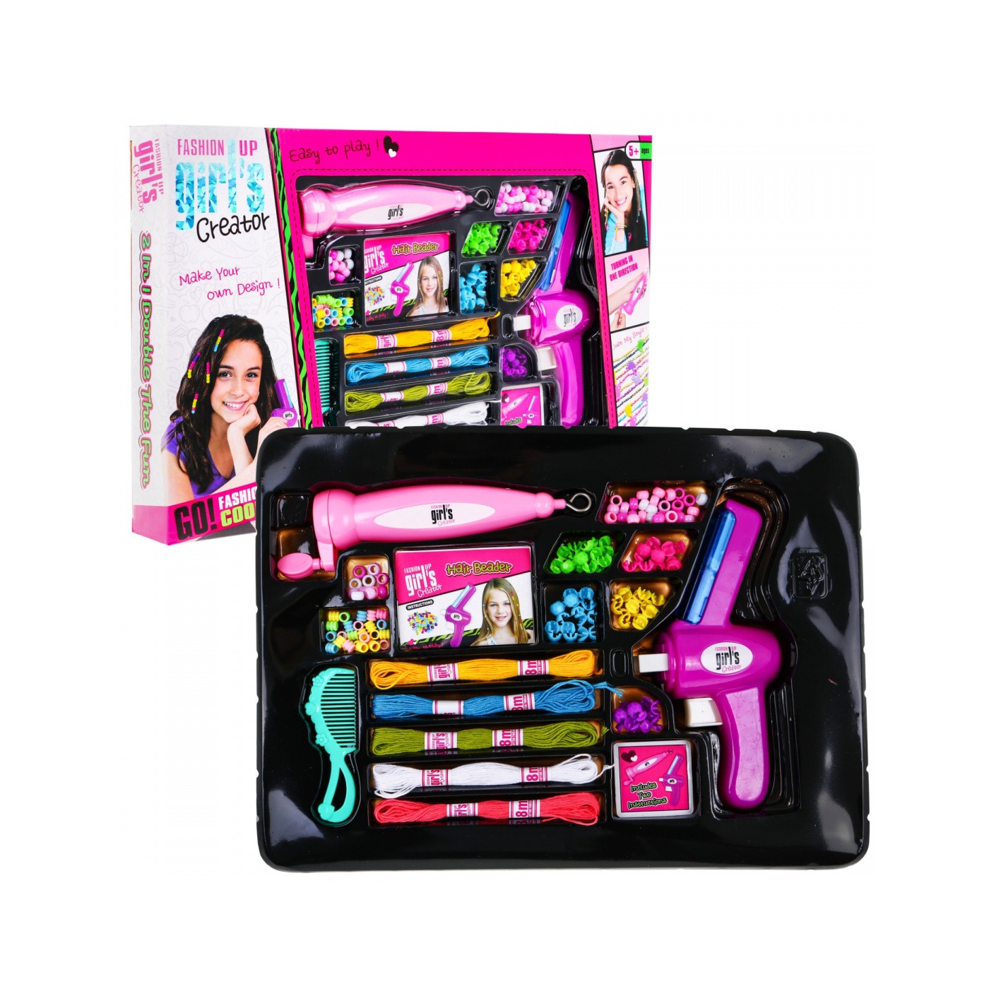 | - kolorowy i przydatny w zestawie grzebyk, - maszynka do zaplatania sznureczków, - maszynka do przewlekania , - pakiet zapinanych koralików, - zestaw różnorodnych koralików, - bogaty pakiet koralików do nawlekania na włosy, - zestaw czterech rodzajów kolorowych, bawełnianych sznureczków, - literki do zawieszania, - obrazkowa instrukcja. |