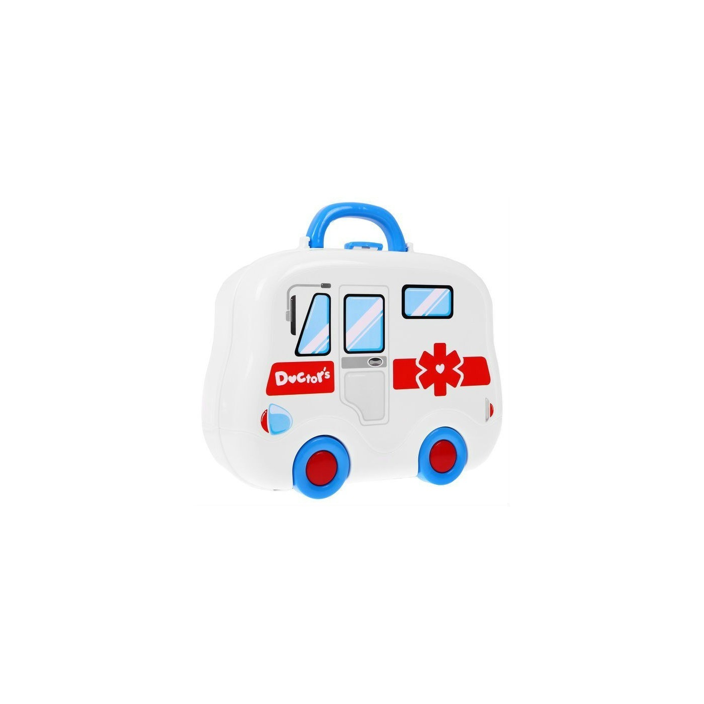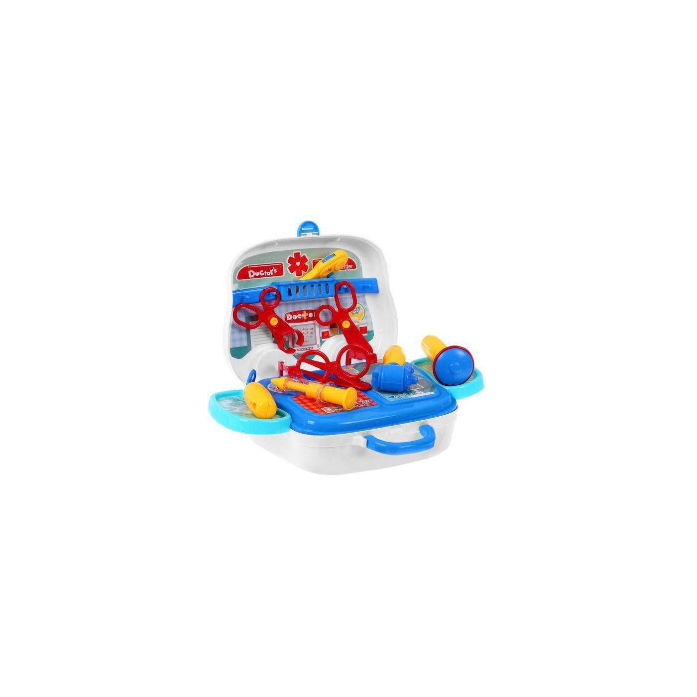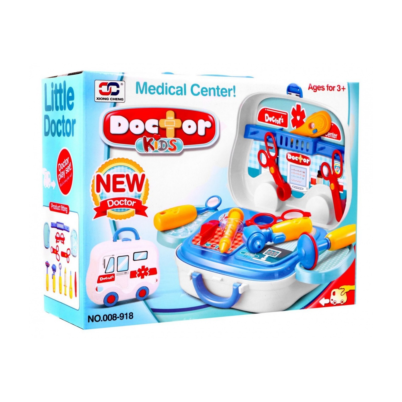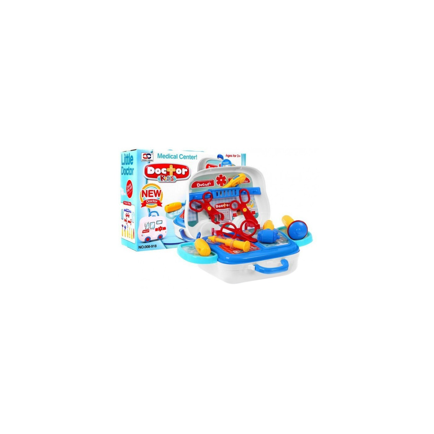 | Zestaw lekarski z narzędziami dla dzieci od 3-go roku życia. Wyposażenie zestawu: - przenośna rozkładana walizka – ambulans na kółkach, - blat z imitacją rezonansu magnetycznego, - 2 boczne półeczki, - wieszak na przybory lekarskie, - okulary, - nożyczki, - nożyczki ze szczypczykami, - termometr, - strzykawka, - pinceta, - wziernik, - lusterko, - młoteczek | |