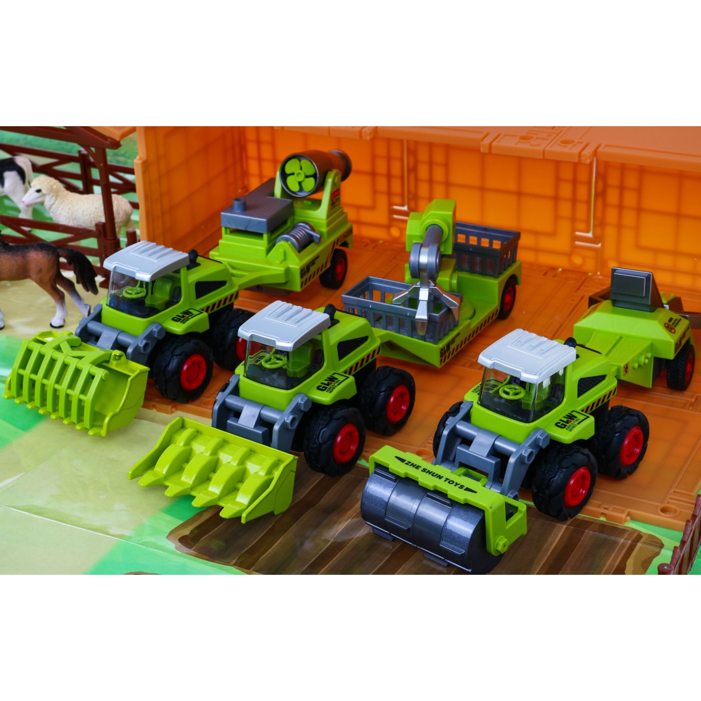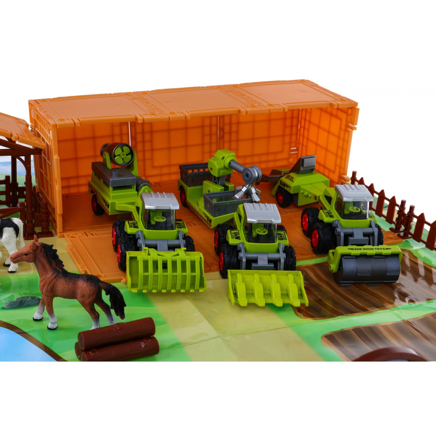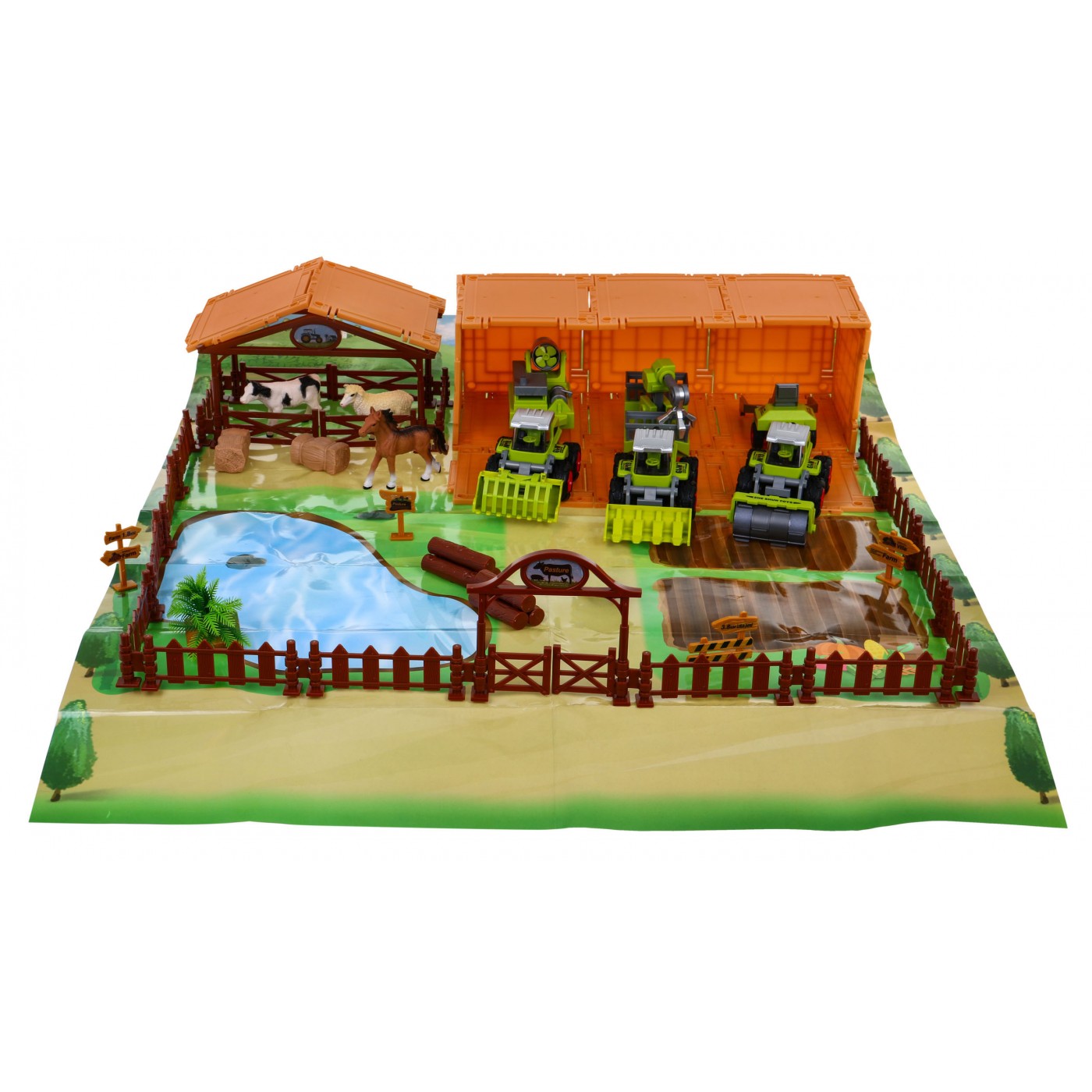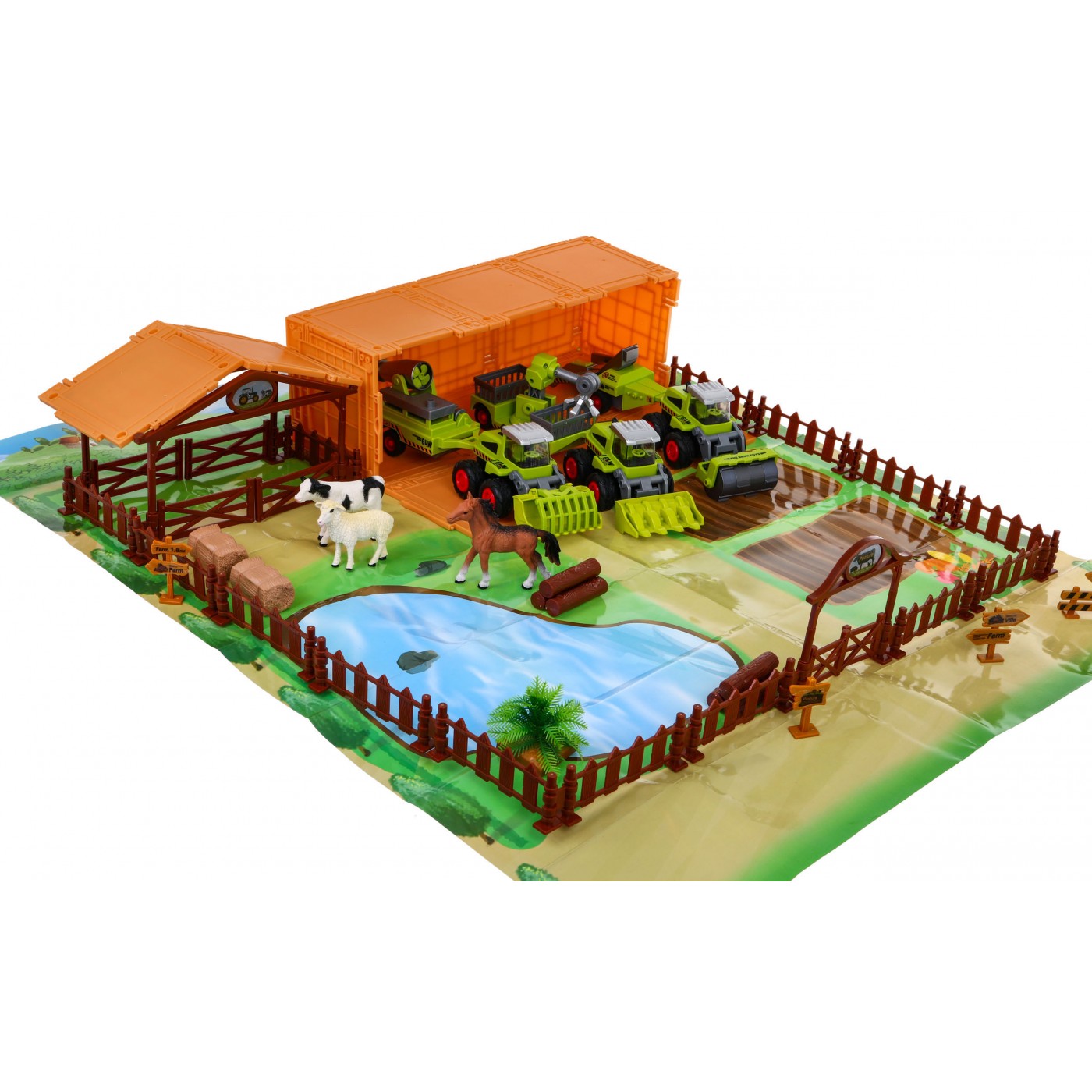 | - elementy konstrukcyjne budynku gospodarczego i zagrody, - elementy konstrukcyjne płotu, - duża mata z gospodarstwem, - trzy pojazdy rolnicze z odczepianymi przyczepami zbierającymi: * kombajn z przyczepą, * koparka z przyczepą, * walec z przyczepą, - figurki zwierząt – konik, krowa, owca, - figurka farmera z taczkami, - drzewo, - dwie bele słomy, - dwa zestawy drewienek, - naklejki dekoracyjne, - instrukcja. |