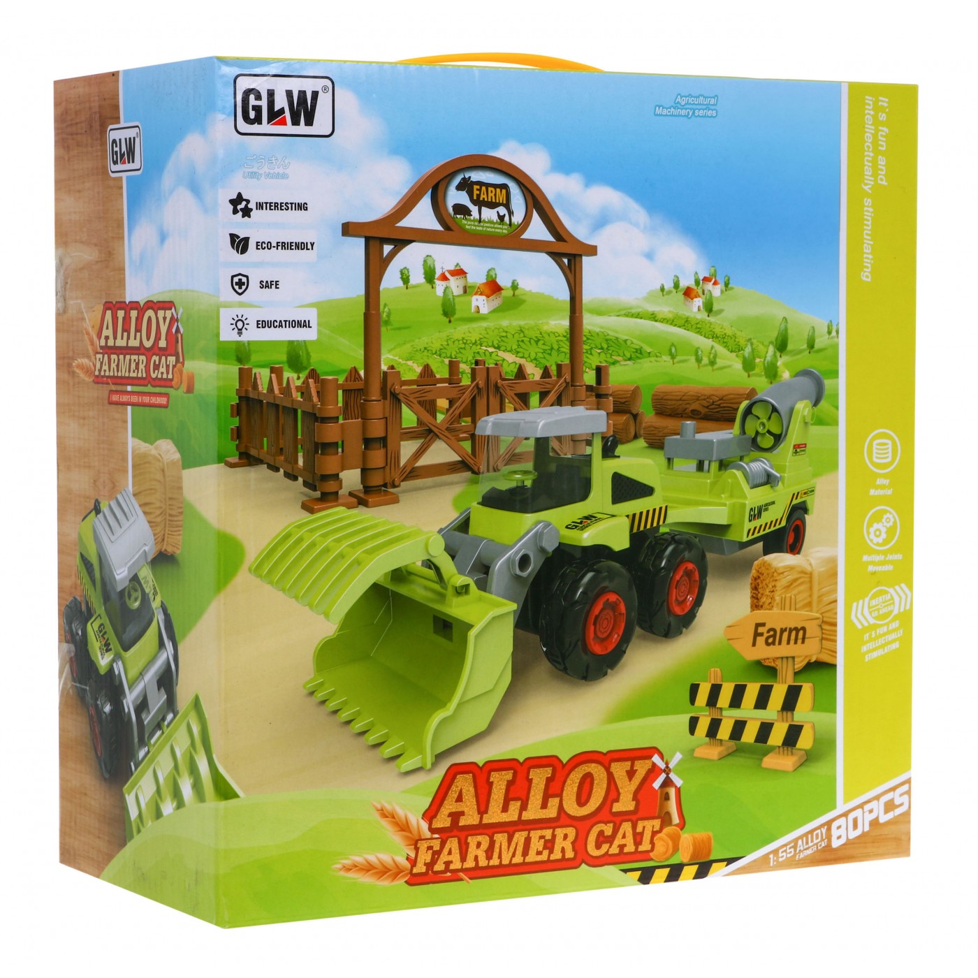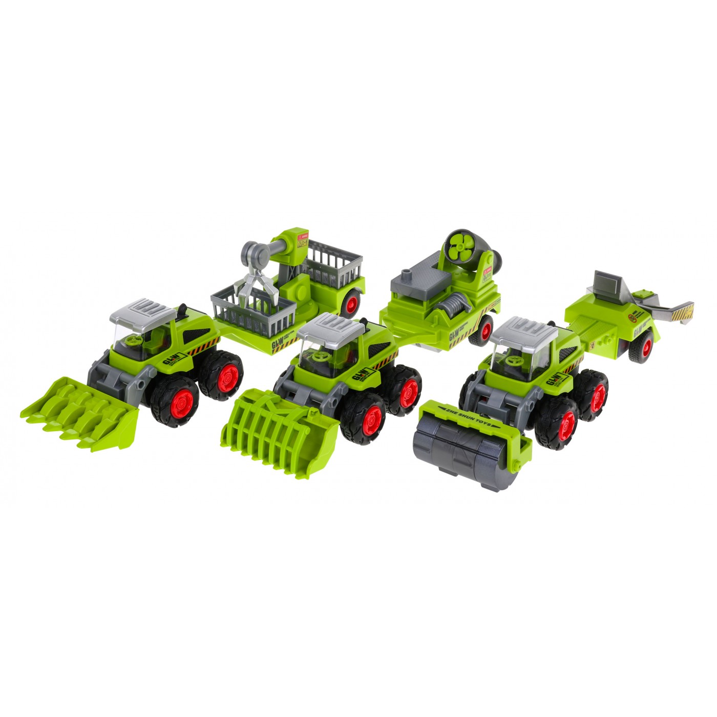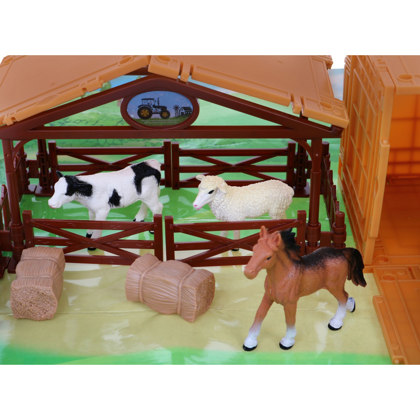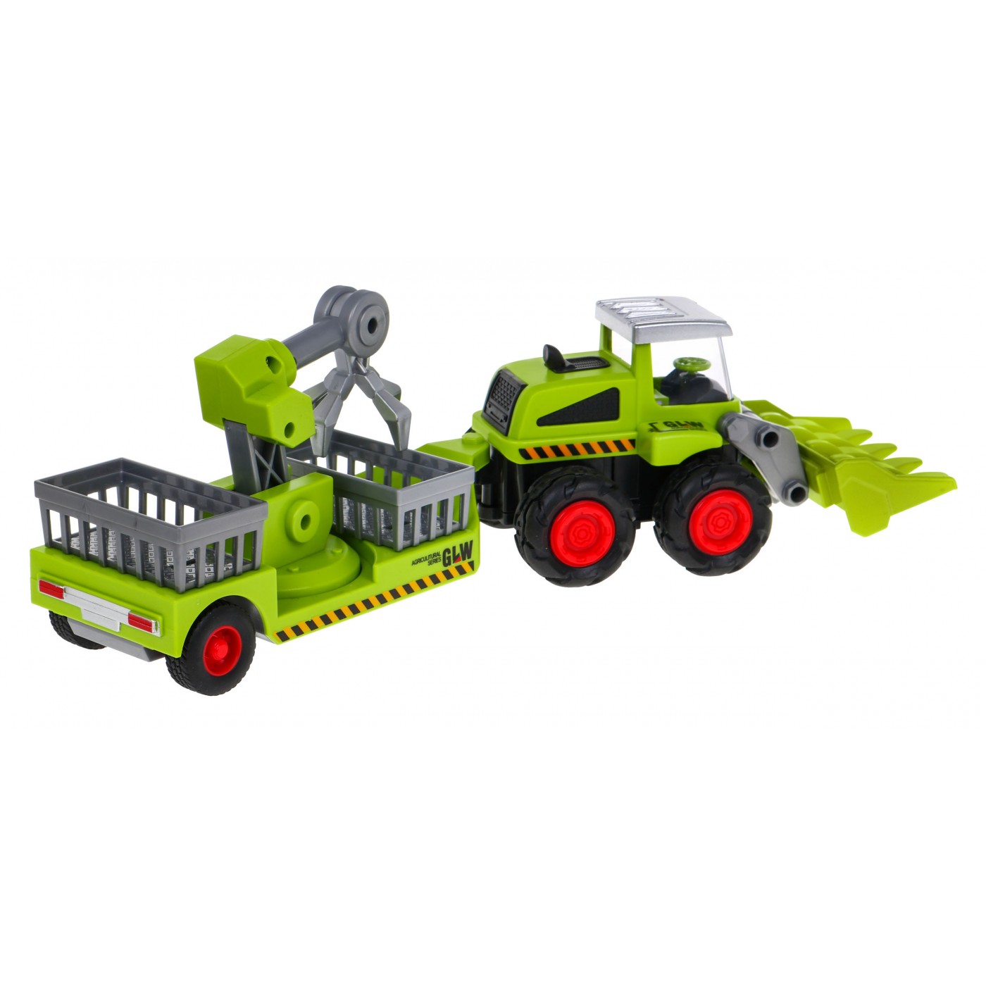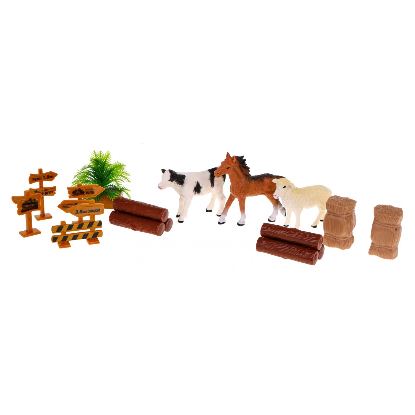 | - elementy konstrukcyjne budynku gospodarczego i zagrody, - elementy konstrukcyjne płotu, - duża mata z gospodarstwem, - trzy pojazdy rolnicze z odczepianymi przyczepami zbierającymi: * kombajn z przyczepą, * koparka z przyczepą, * walec z przyczepą, - figurki zwierząt – konik, krowa, owca, - figurka farmera z taczkami, - drzewo, - dwie bele słomy, - dwa zestawy drewienek, - naklejki dekoracyjne, - instrukcja. |