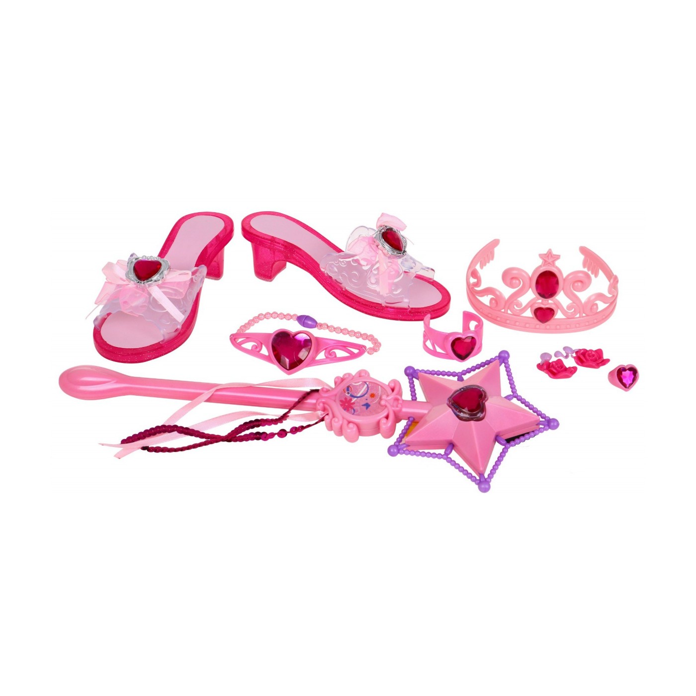| - 2 x pantofelek (długość ok. 19 cm, szerokość ok. 7 cm, wysokość obcasa ok. 4 cm), - interaktywna różdżka (ok. 15,5 cm x 11,5 cm), - diadem, - naszyjnik, - bransoletka, - 2 x kolczyki, - pierścionek. | |