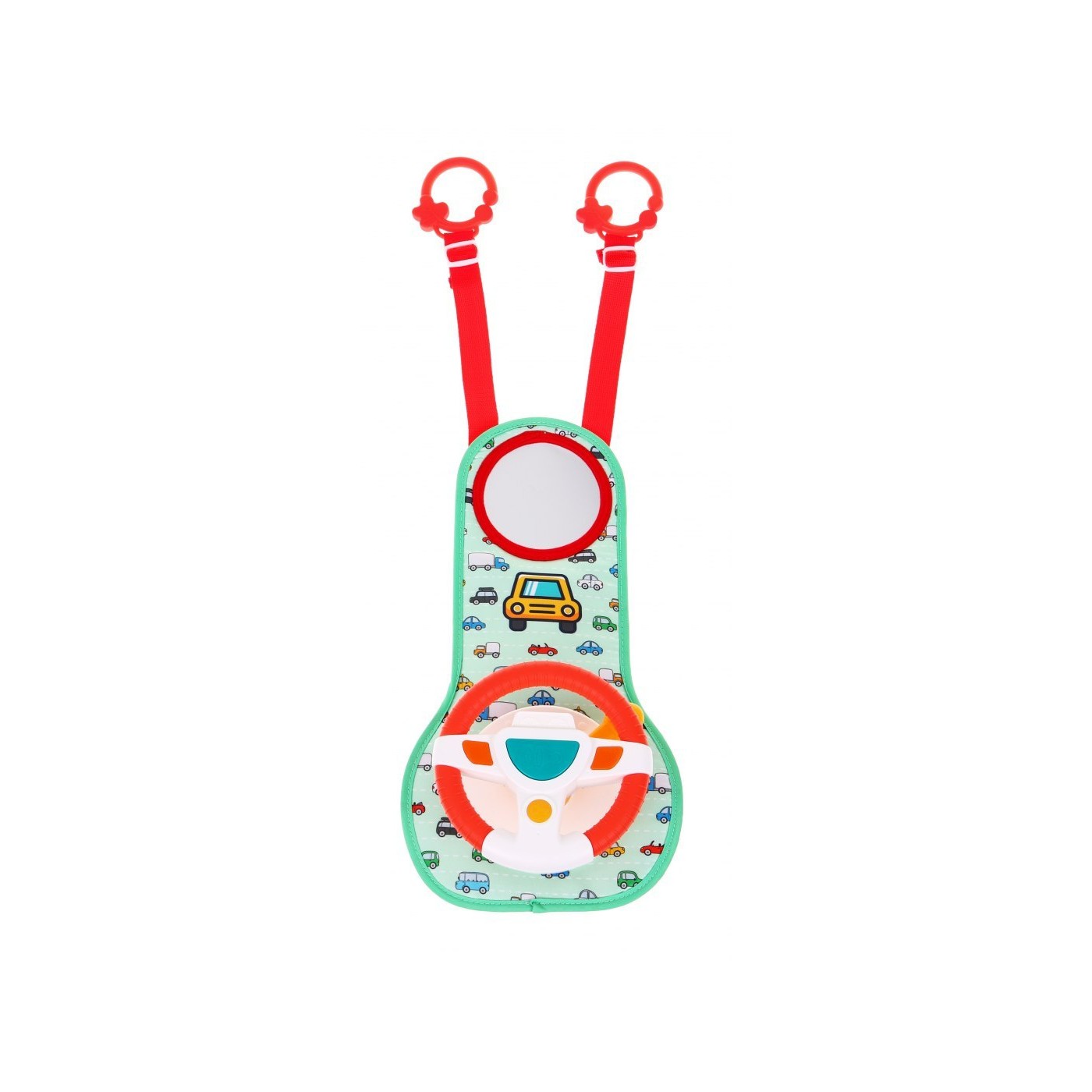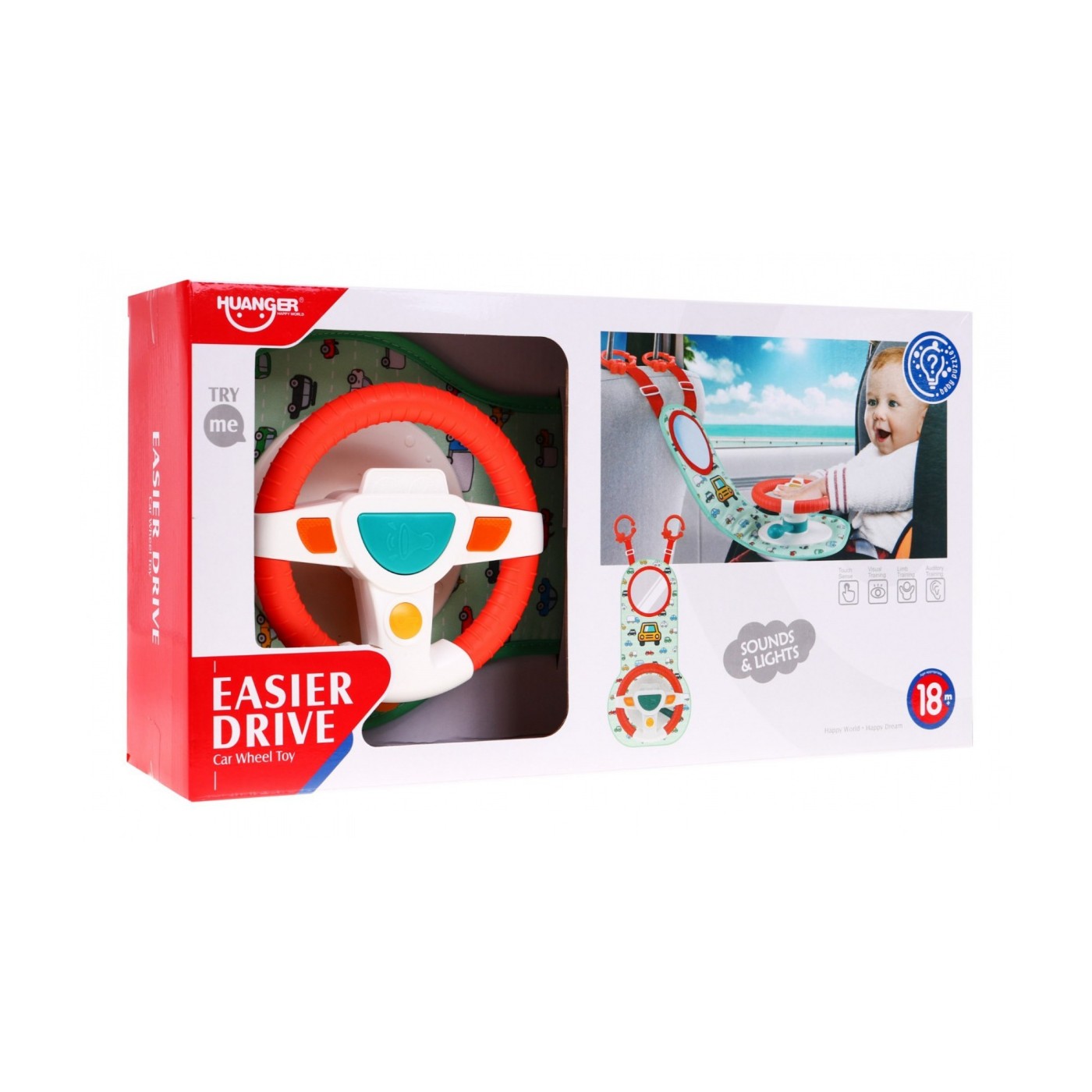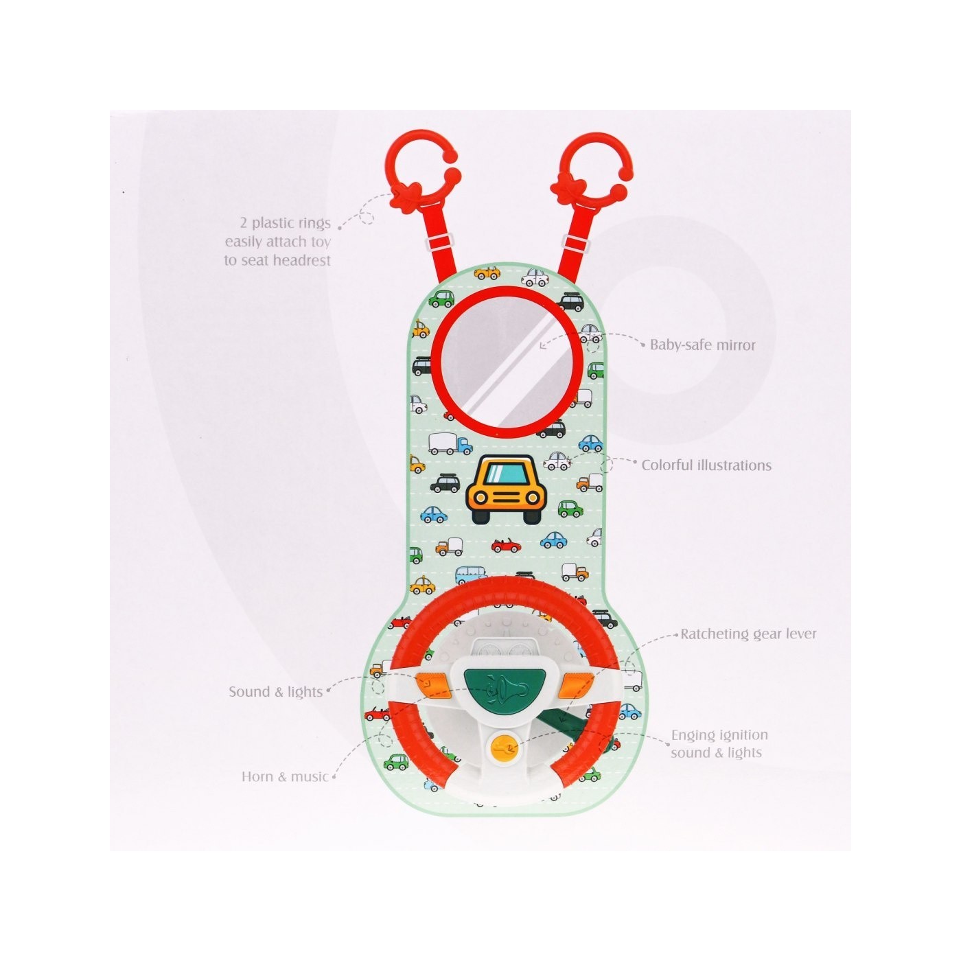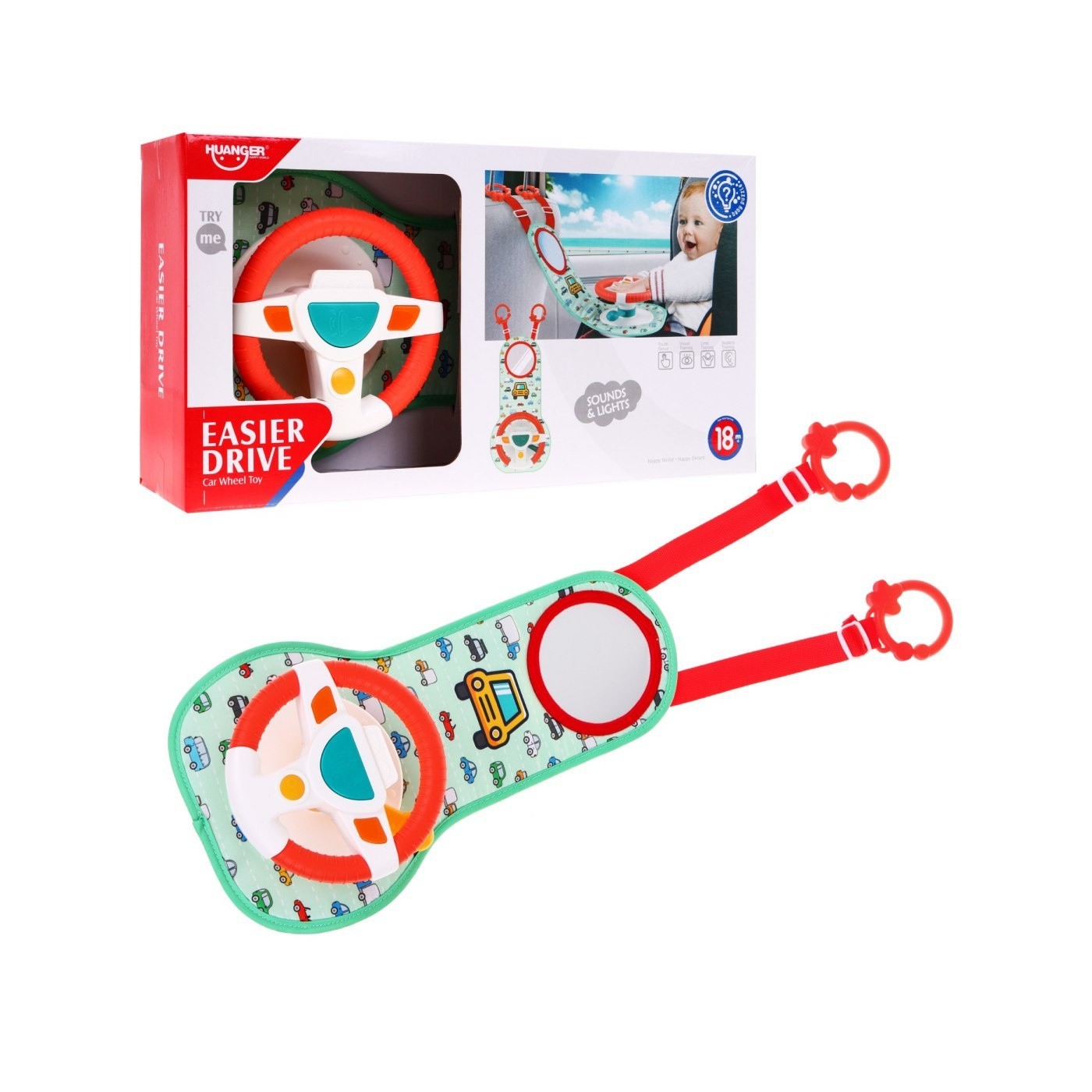 | | Interaktywny zestaw dla dzieci już od 18 miesiąca życia umili dziecku czas podczas podróży. Twój maluch poczuje się jak prawdziwy kierowca i będzie mógł naśladować ruchy rodzica podczas jazdy. Zestaw przeznaczony jest tylko dla dzieci siedzących przodem do kierunku jazdy, nie należy używać w przypadku niemowląt skierowanych tyłem do kierunku jazdy. Zestaw łatwo przyczepia się do zagłówka siedzenia. Zabawka stymuluje rozwój zmysłów dziecka poprzez dźwięki i światła. Zabawka zasilana jest bateriami typu 3 x AA (w zestawie). |