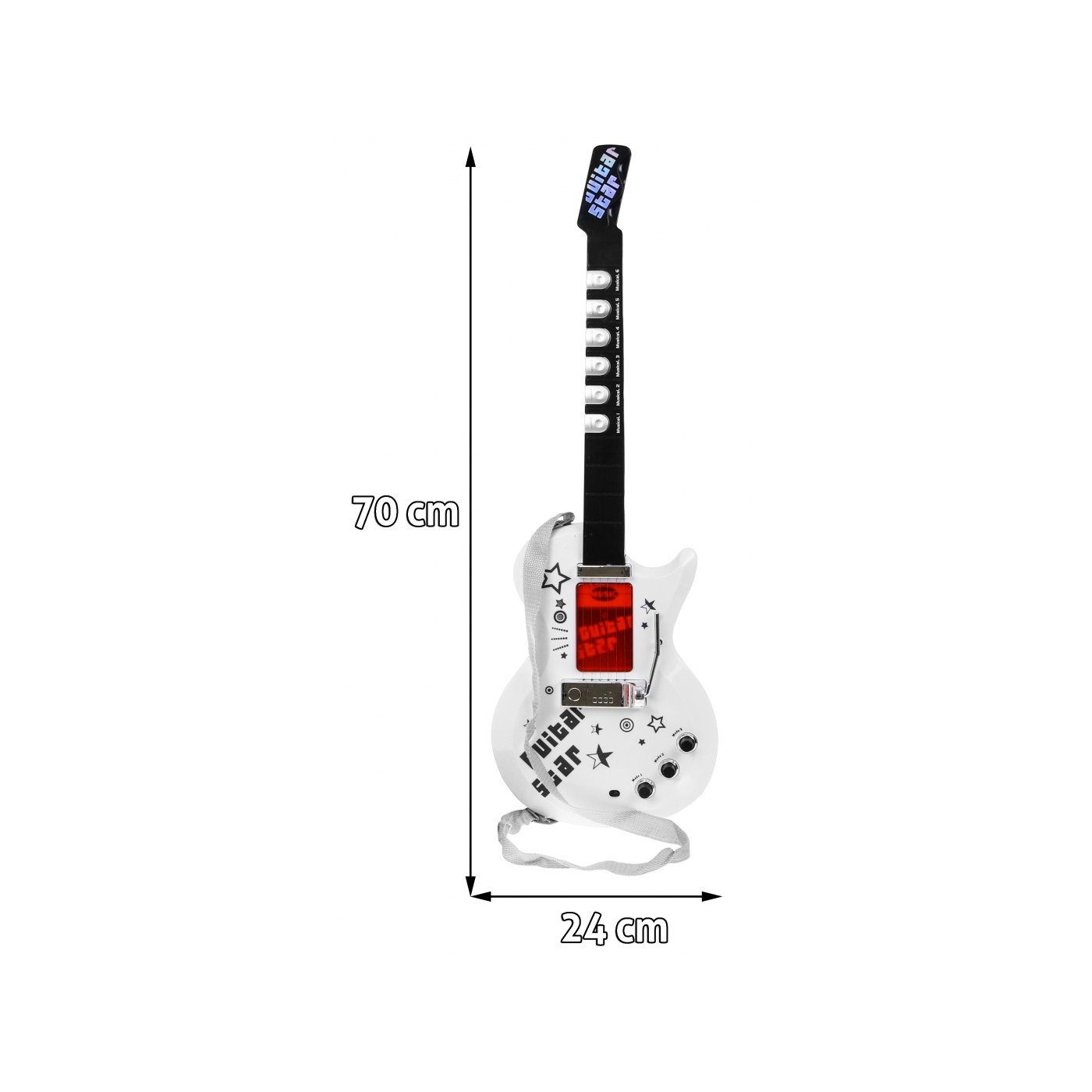 | | Niepowtarzalna gitara elektryczna dla przyszłego gitarzysty wraz z mikrofonem w zestawie. Gitara to niezwykle inspirujący instrument muzyczny z grupy strunowych szarpanych, który odgrywa niezwykle ważną rolę w muzyce bluesowej, country, flamenco, rockowej oraz w wielu formach popu. Dziecko już w pierwszych latach życia wykazuje zainteresowanie zabawkami grającymi, tańczy, śpiewa, próbuje grać na prostych instrumentach. Obecność muzyki w rozwoju dziecka ma zdecydowanie pozytywny wpływ. Talent ujawniony w tak wczesnym okresie ma szansę znacznie się rozwinąć w przyszłości, dlatego też nie można przegapić tego momentu. Jeżeli Twoje dziecko z niewyobrażalnym zachwytem patrzy na gitarzystów, udaje, że gra na wyimaginowanej gitarze i ma poczucie rytmu - to może mieć talent do gry na każdej gitarze. Zabawka wyposażona jest w 6 metalowych strun, 3 tony gitary, 7 melodii i 12 krótkich solówek. |