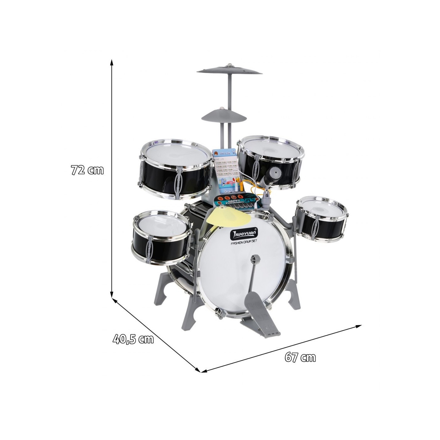 | - perkusja ok. 72 cm x 67 cm x 40,5 cm, - bęben duży o średnicy 30 cm, - bęben średni o średnicy ok. 20 cm, - bęben mały o średnicy ok. 15 cm, - talerz metalowy o średnicy ok. 20 cm, - talerz elektryczny ok. 11,5 cm x 14 cm, - pałeczki ok. 23,5 cm, - stojak ok. 65 cm wysokości, - stołeczek ok. 22 cm x 19 cm, - opakowanie ok. 61 cm x 38 cm x 20,5 cm. |