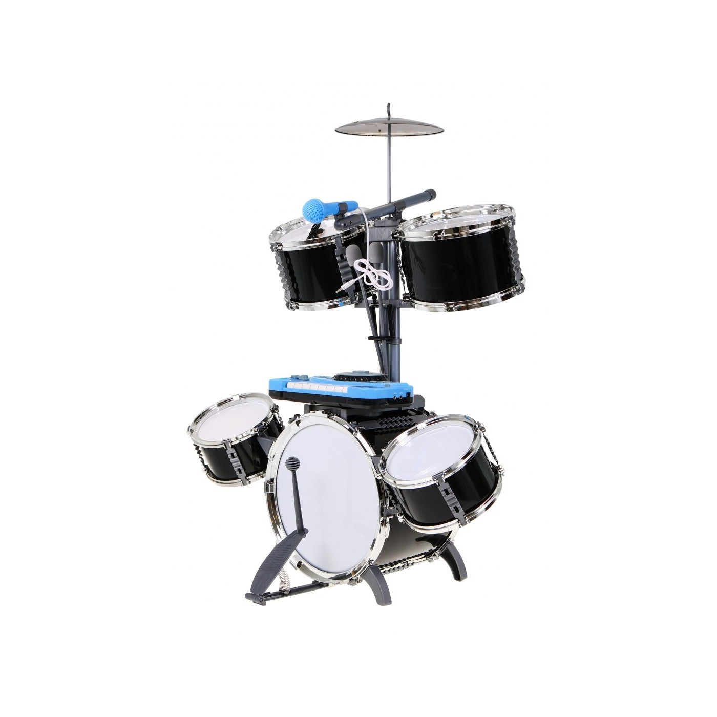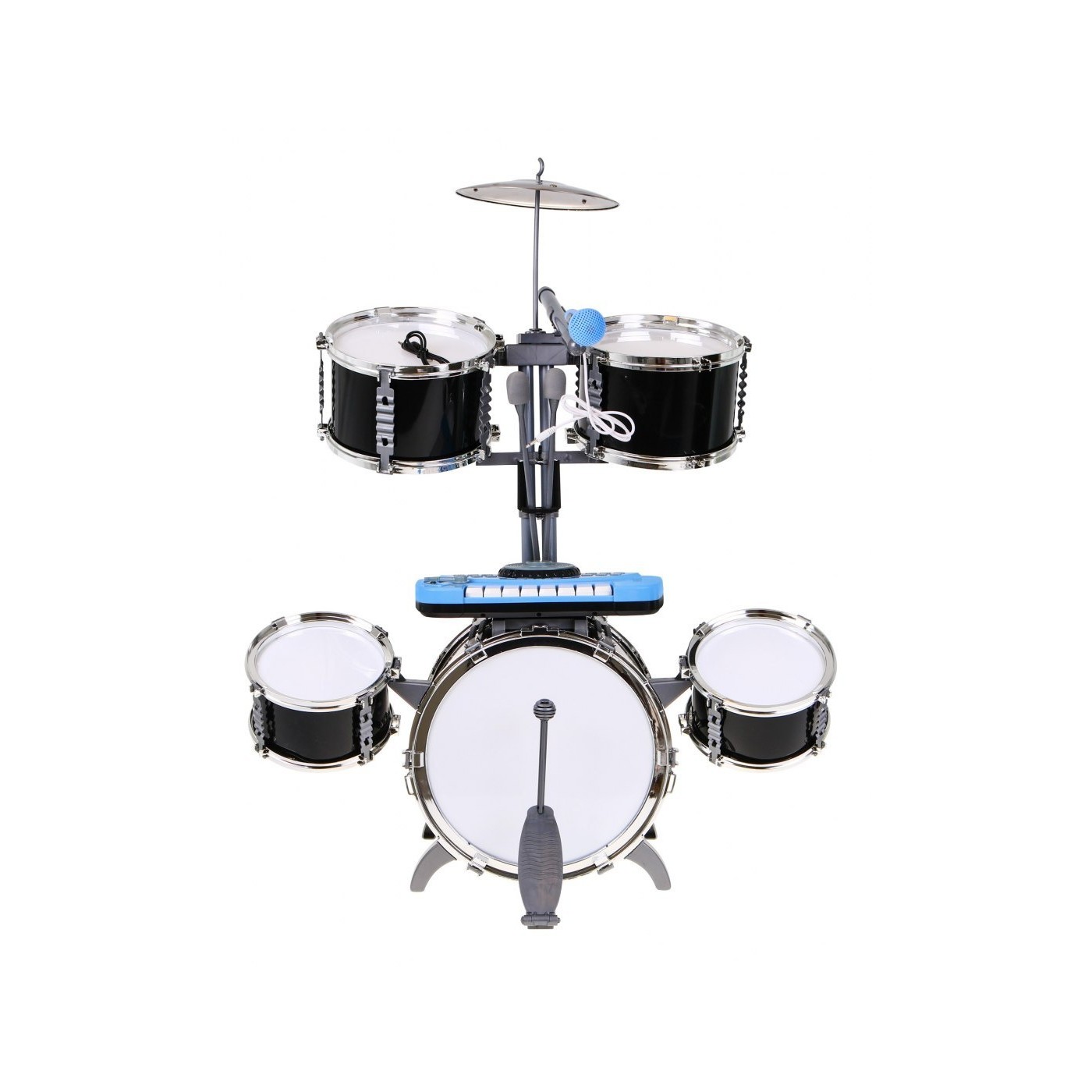 | - 1 bęben duży z pedałem do uderzania, - 2 bębny średnie, - 2 bębny małe, - 2 pałeczki do uderzania, - talerz, - keyboard z mikserem, - mikrofon, - stołeczek, - kabel MP3. | |