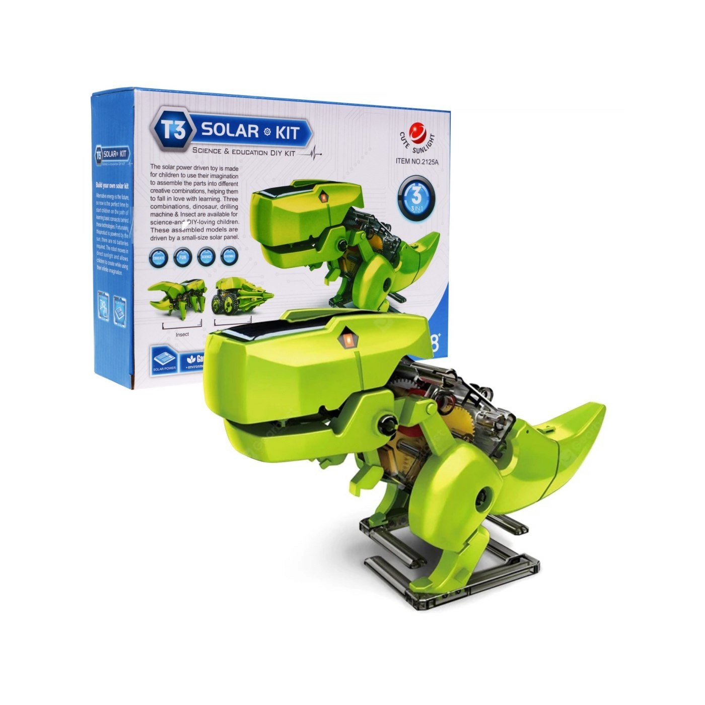 | Zestaw solarny z którego można zbudować dinozaura, wiertarkę czy owada. Wszystkie wersje zasilane są panelem solarnym. Panel solarny nie wymaga alternatywnego źródła energii a jest zasilany jedynie światłem słonecznym. Najlepsze efekty uzyskamy przy pełnym słońcu, ale nawet w pomieszczeniu można uzyskać satysfakcjonujące efekty, przy 100V żarówce. Do skonstruowania zestawu nie potrzeba żadnego kleju czy narzędzi. Potrzebny jest jedynie przecinak do rozdzielenia części zestawu. Zabawka przeznaczona jest dla dzieci od 8 – go roku życia i posiada certyfikat CE. Solarny zestaw to znakomita zabawka dla wszystkich ciekawych świata dzieci. Pozwala kreatywnie spędzać czas a ponadto uczy czerpania pożytku z energii słonecznej. Zestaw gwarantuje wspaniałą zabawę podczas której poznajemy jak energia światła zasila napęd elektryczny. Zestaw pozwala dzieciom na naukę poprzez zabawę, to naturalna forma poznawania świata, która jest najbardziej przyjemna i przyswajalna dla dzieci, a rozbudzona w nich kreatywność zaowocuje na przyszłe życie.