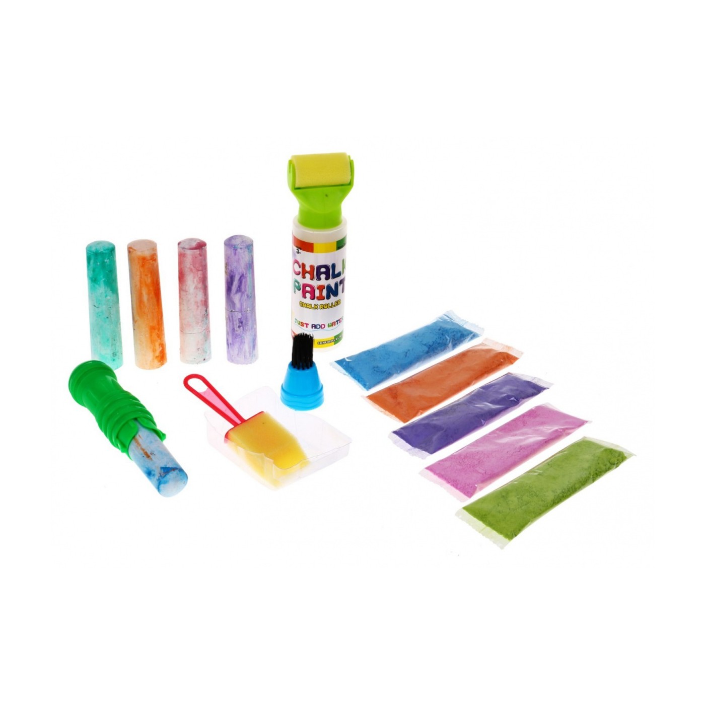| -5 kredowych barwników, - uchwyt na kredę, - 5 wałków kredy, - szczotka, - pojemniczek, - butelka na farbę, - końcówka do butelki na farbę z wałkiem z gąbki, - miotełka z gąbką, - szablony z potworkami. | |