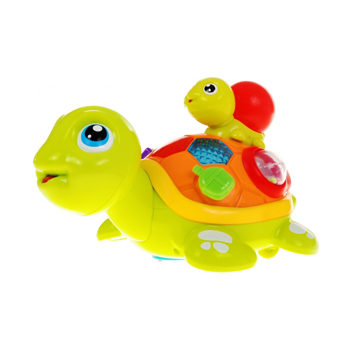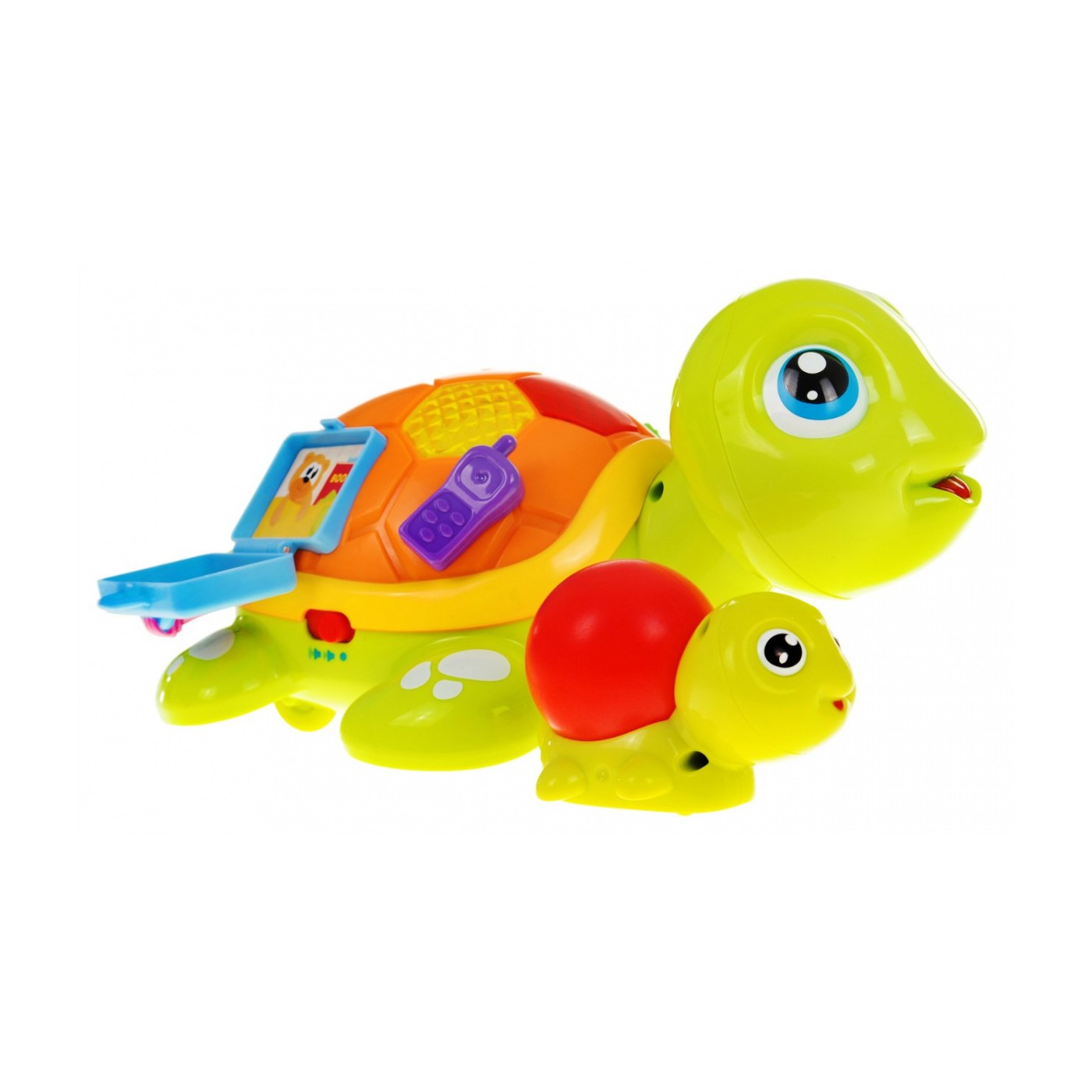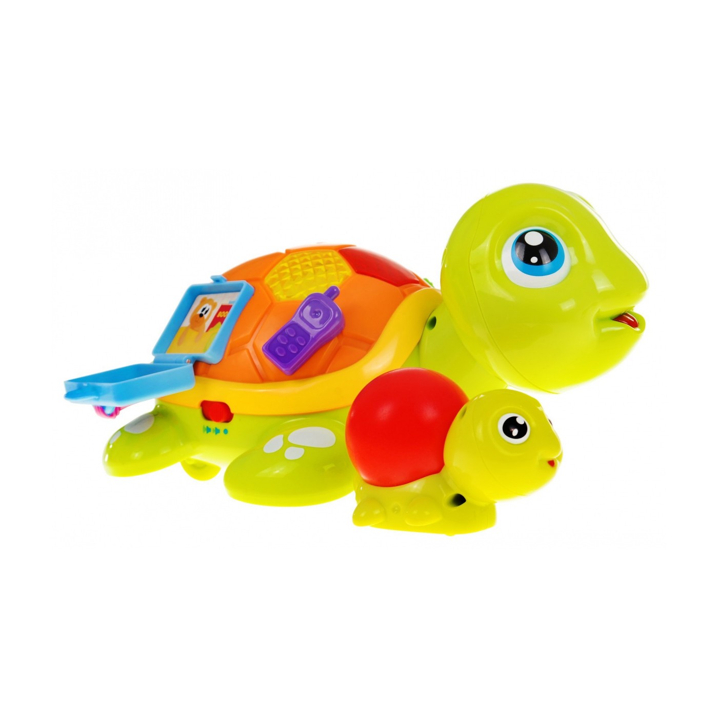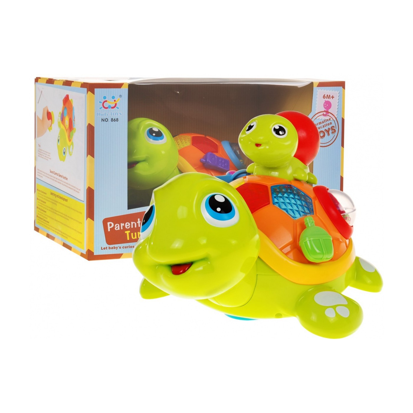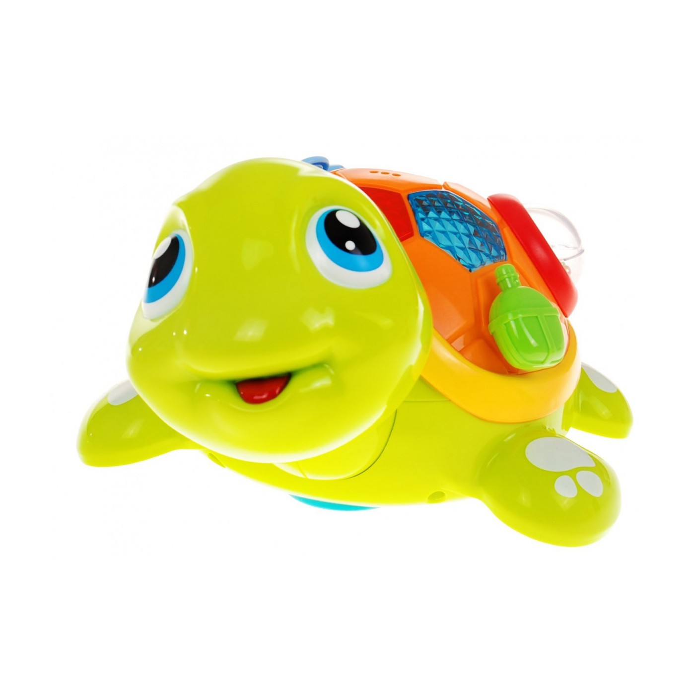 | | Żółw jest wyposażony w całą paletę ciekawych funkcji. Znajdziemy tu sensory dotykowe (rozmieszczone na łapkach i głowie Taty Żółwia), sensor rozpoznawania dźwięków, przyjemne dla oka kolory, dźwięki oraz melodie. Przycisk uruchamiający zabawkę znajduje się z boku zabawki, wraz z dwu stopniową regulacją głośności. Po przesunięciu przycisku zabawka zostanie wprawiona w ruch. W rytm barwnych melodii Tata Żółw wraz z małym żółwikiem na grzbiecie wyruszą w radosną podróż. Gdy melodia się skończy mały żółwik ześlizgnie się z grzbietu Taty. Możesz go ponownie posadzić na skorupie Taty lub przysunąć do ogona (uruchomi się kolejna funkcja zabawki, obydwa żółwiki pomaszerują dalej). Sensor rozpoznawania dźwięków pozwoli na kontrolowanie Taty Żółwia za każdym razem, gdy naciśniemy skorupkę małego żółwika. Funkcja ta może uruchamiać i zatrzymywać zabawkę. Dodatkowo rozwój umiejętności manualnych poprawią gadżety umieszczone na skorupie Taty Żółwia. ZNAJDZIEMY TUTAJ: - manierkę, - telefon, - otwieraną walizeczkę, - obrotową kulę z kolorowymi kuleczkami. Tata Żółw sam jeździ, odbija się od przeszkód i zawraca. Zabawka posiada przełącznik on/off oraz dwu stopniową regulację natężenia głośności umieszczone z boku zabawki. |