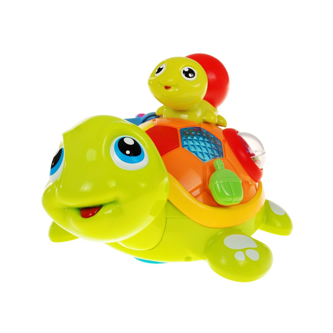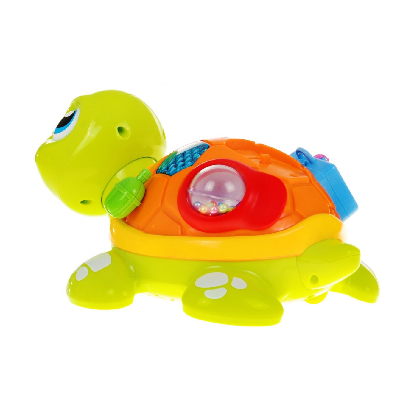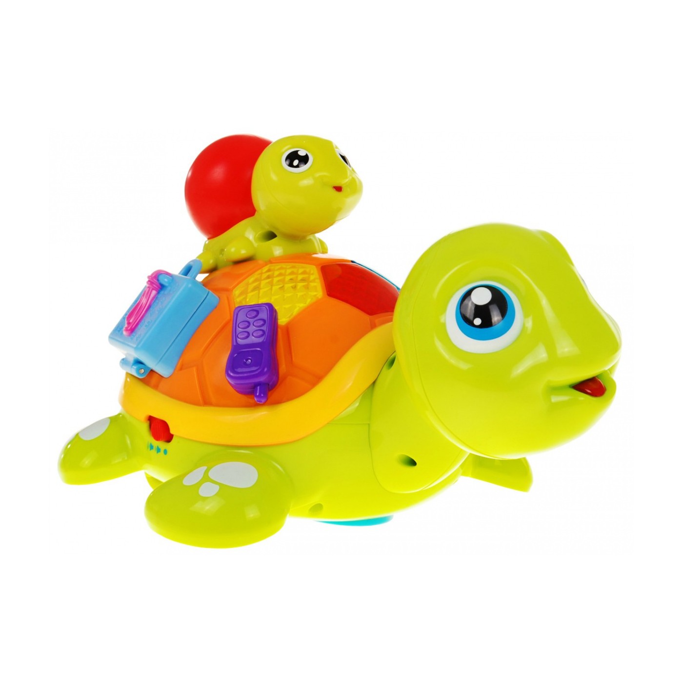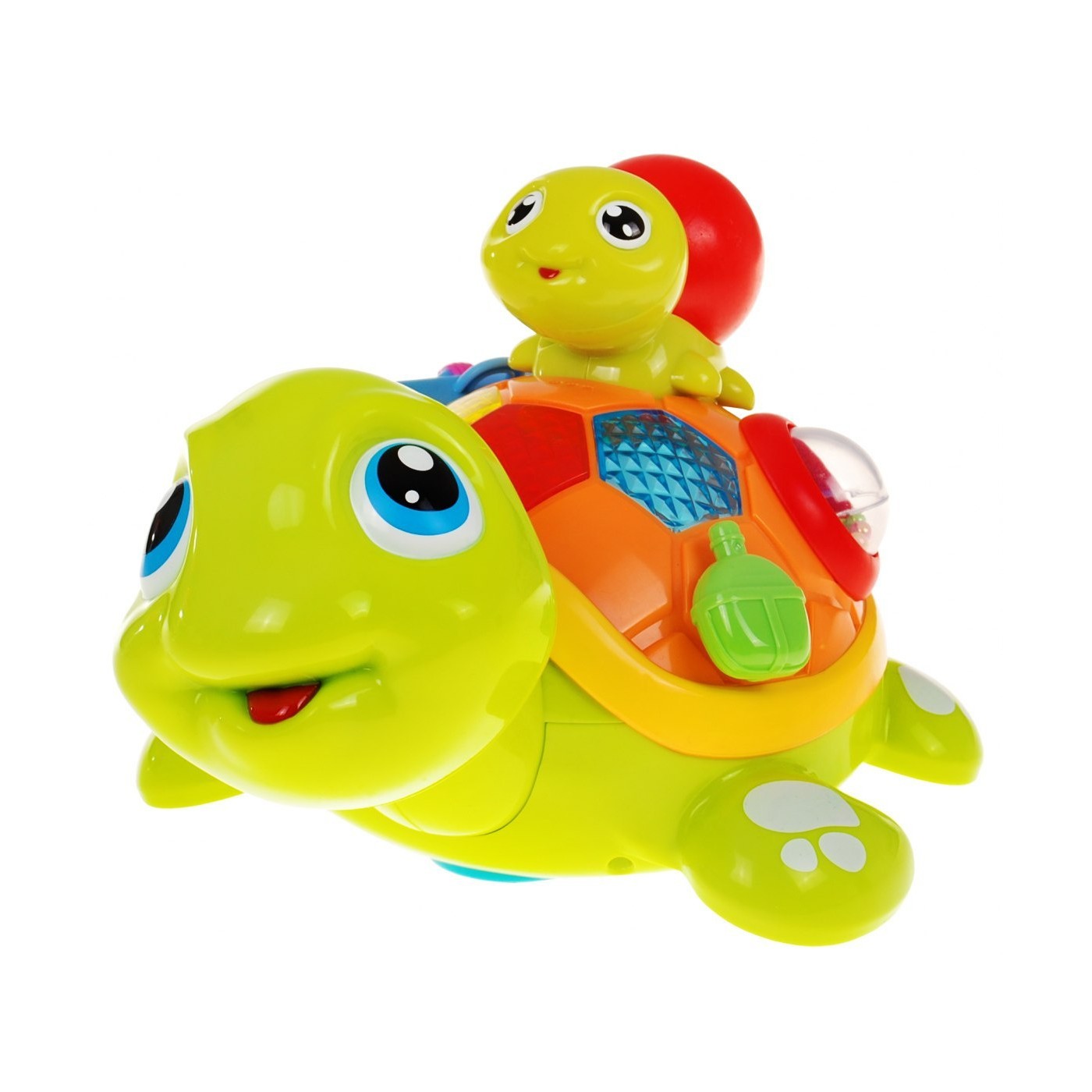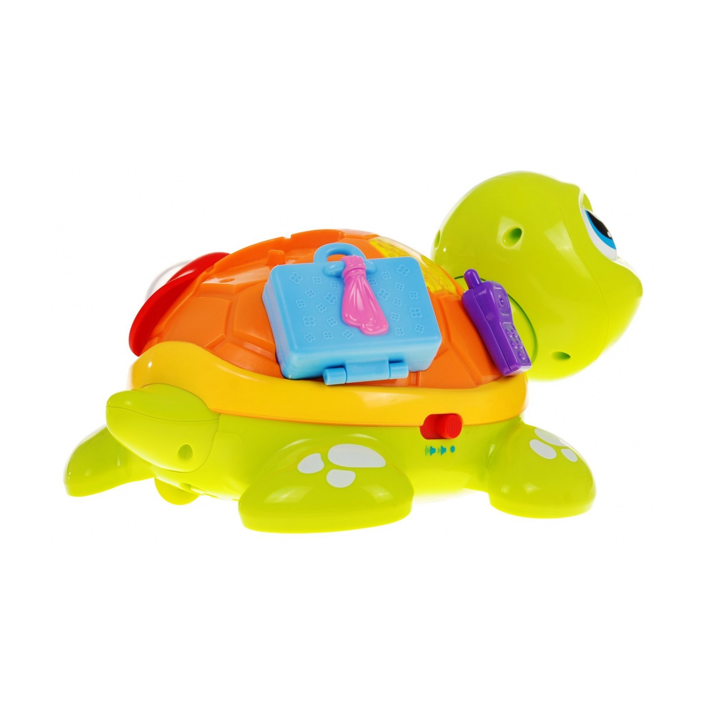 | | Żółw jest wyposażony w całą paletę ciekawych funkcji. Znajdziemy tu sensory dotykowe (rozmieszczone na łapkach i głowie Taty Żółwia), sensor rozpoznawania dźwięków, przyjemne dla oka kolory, dźwięki oraz melodie. Przycisk uruchamiający zabawkę znajduje się z boku zabawki, wraz z dwu stopniową regulacją głośności. Po przesunięciu przycisku zabawka zostanie wprawiona w ruch. W rytm barwnych melodii Tata Żółw wraz z małym żółwikiem na grzbiecie wyruszą w radosną podróż. Gdy melodia się skończy mały żółwik ześlizgnie się z grzbietu Taty. Możesz go ponownie posadzić na skorupie Taty lub przysunąć do ogona (uruchomi się kolejna funkcja zabawki, obydwa żółwiki pomaszerują dalej). Sensor rozpoznawania dźwięków pozwoli na kontrolowanie Taty Żółwia za każdym razem, gdy naciśniemy skorupkę małego żółwika. Funkcja ta może uruchamiać i zatrzymywać zabawkę. Dodatkowo rozwój umiejętności manualnych poprawią gadżety umieszczone na skorupie Taty Żółwia. ZNAJDZIEMY TUTAJ: - manierkę, - telefon, - otwieraną walizeczkę, - obrotową kulę z kolorowymi kuleczkami. Tata Żółw sam jeździ, odbija się od przeszkód i zawraca. Zabawka posiada przełącznik on/off oraz dwu stopniową regulację natężenia głośności umieszczone z boku zabawki. |