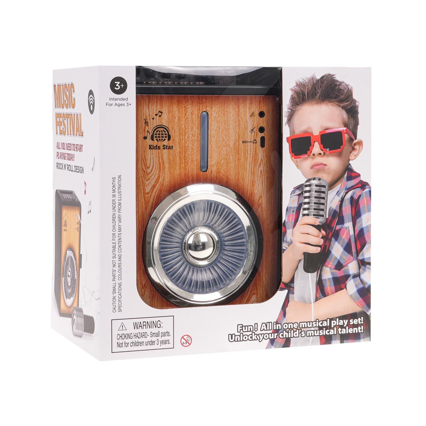 Perfektne spracovaný, zosilňovač s mikrofónom a funkciou Bluetooth pre deti od 3 rokov. Súprava vyzerá veľmi profesionálne a má veľa funkcií. V hornej časti sú funkčné tlačidlá a gombík na ovládanie hlasitosti. Po otočení stočeného zosilňovača nás zosilňovač privíta hudbou a blikajúcimi svetlami, ktoré nás nabádajú k hre. Po stlačení prvého tlačidla zľava sa nám ozve skladba, jedna z ôsmich rockových skladieb. Stlačením tlačidla noty sa aktivuje jedna z 8 detských melódií. Tlačidlo s tlieskacími rukoväťami aktivuje jeden z 9 zvukových efektov, napr. Tlačidlo bubna aktivuje jeden z 3 rytmov bubna. Máme tu aj tlačidlo na prepojenie zosilňovača s externým zariadením, napr . Ďalšie tlačidlá slúžia na nahrávanie hlasu a prehrávanie nahrávky. Tlačidlo so svetielkom slúži na zmenu osvetlenia na reproduktore. Na výber je až 9 svetelných kompozícií. Nad reproduktorom sa nachádza vstup pre mikrofón, ktorý je súčasťou zostavy, vstup pre pripojenie napr. gitary, zásuvka na nabíjanie. Hračka je napájaná 3 x AAA 1,5 V batériami (nie sú súčasťou balenia).
