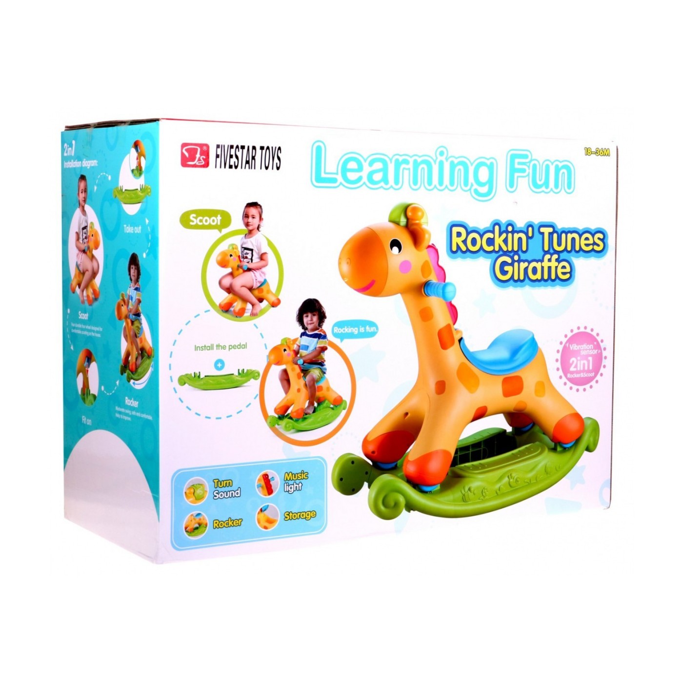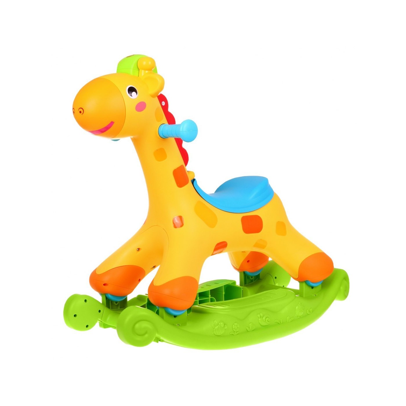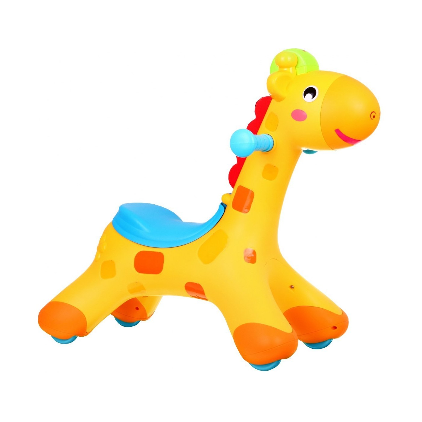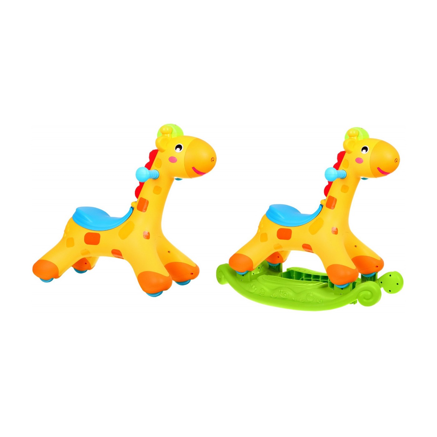 | | Bujak lub jeździk (zestaw 2w1) + dźwięki (5 wesołych melodyjek). Melodyjki można uruchomić/zmieniać poprzez naciśnięcie dużego przycisku z gwiazdką lub włączają się automatycznie gdy żyrafa zamienia się w jeździk. Pod ruchomym siodełkiem znajduje się mały schowek. Dodatkową atrakcją jest duża grzechotka znajdująca się na głowie żyrafy. 1. Baza żyrafy przystosowana jest albo do bujania albo do jeżdżenia. 2. Podnóżki na stópki są tak zaprojektowane, aby zapewnić maksymalną wygodę i bezpieczeństwo Pociechy. 3. Przy płozach zamontowano stópki, które skutecznie zapobiegają wywróceniu się zabawki. |