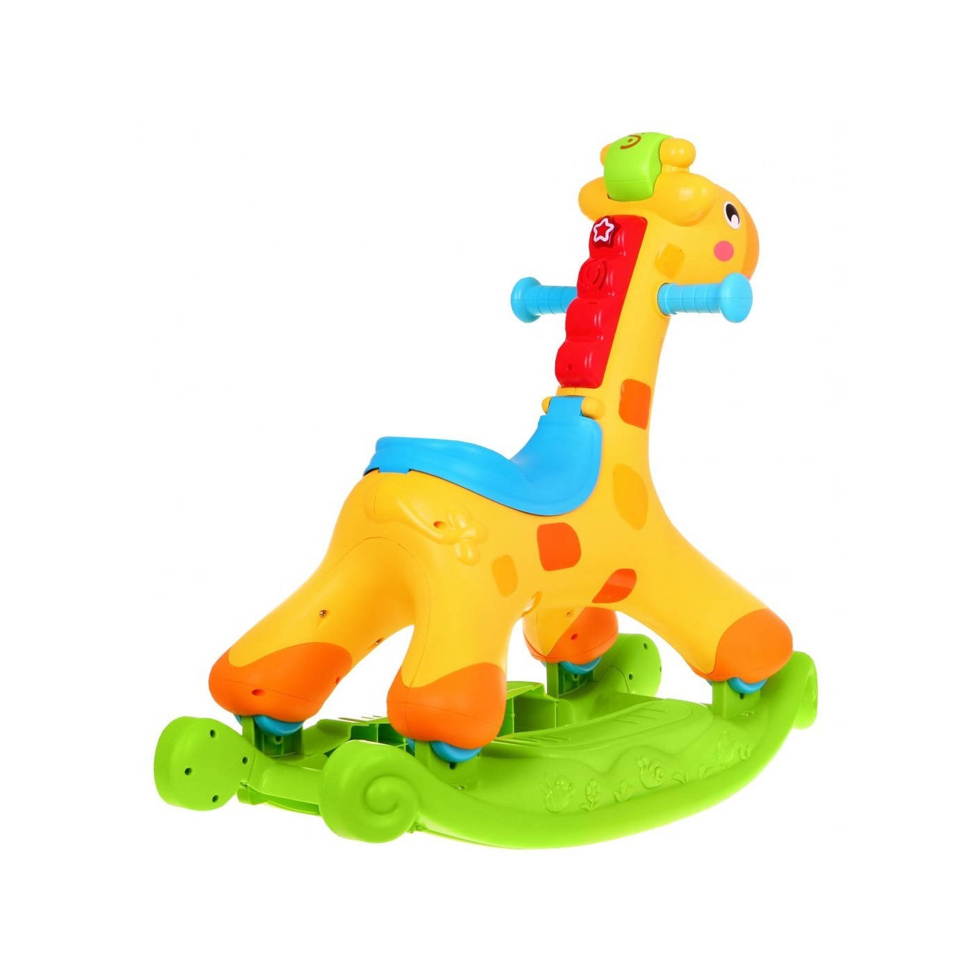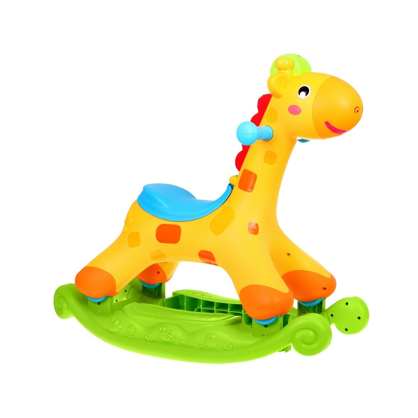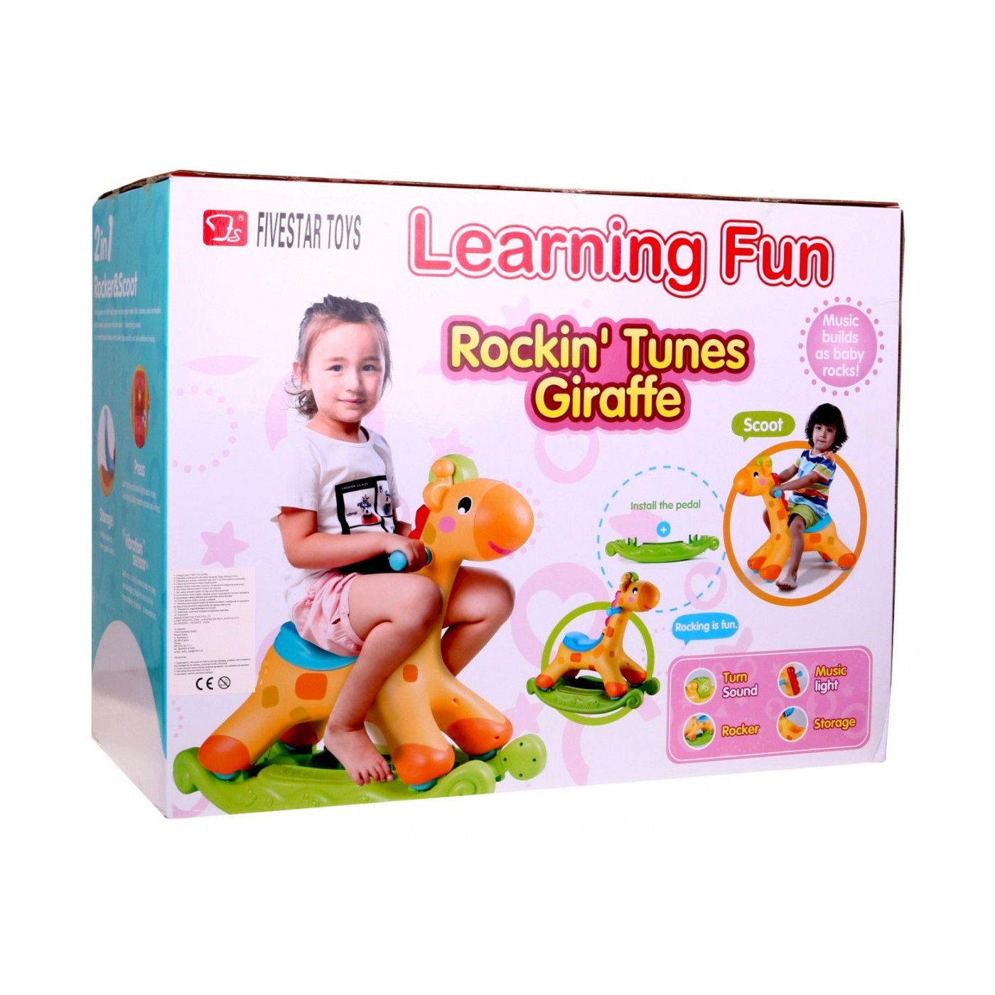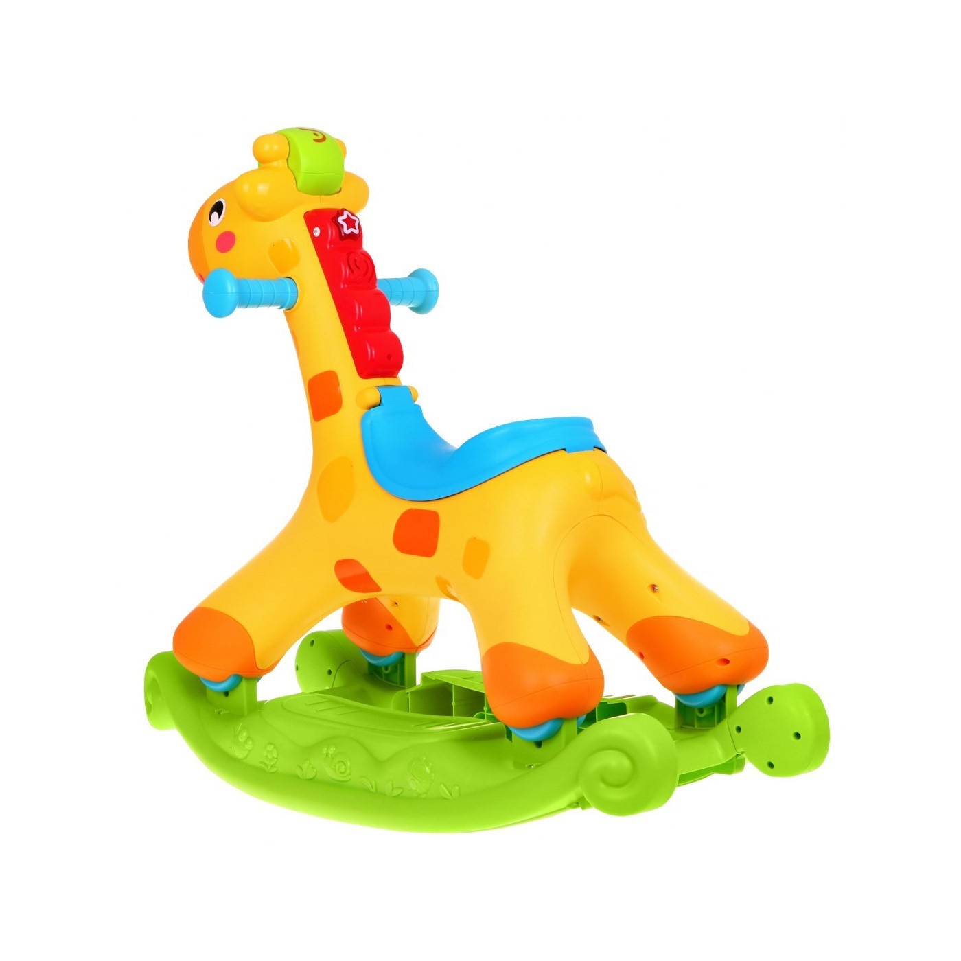| | Bujak lub jeździk (zestaw 2w1) + dźwięki (5 wesołych melodyjek). Melodyjki można uruchomić/zmieniać poprzez naciśnięcie dużego przycisku z gwiazdką lub włączają się automatycznie gdy żyrafa zamienia się w jeździk. Pod ruchomym siodełkiem znajduje się mały schowek. Dodatkową atrakcją jest duża grzechotka znajdująca się na głowie żyrafy. 1. Baza żyrafy przystosowana jest albo do bujania albo do jeżdżenia. 2. Podnóżki na stópki są tak zaprojektowane, aby zapewnić maksymalną wygodę i bezpieczeństwo Pociechy. 3. Przy płozach zamontowano stópki, które skutecznie zapobiegają wywróceniu się zabawki. |